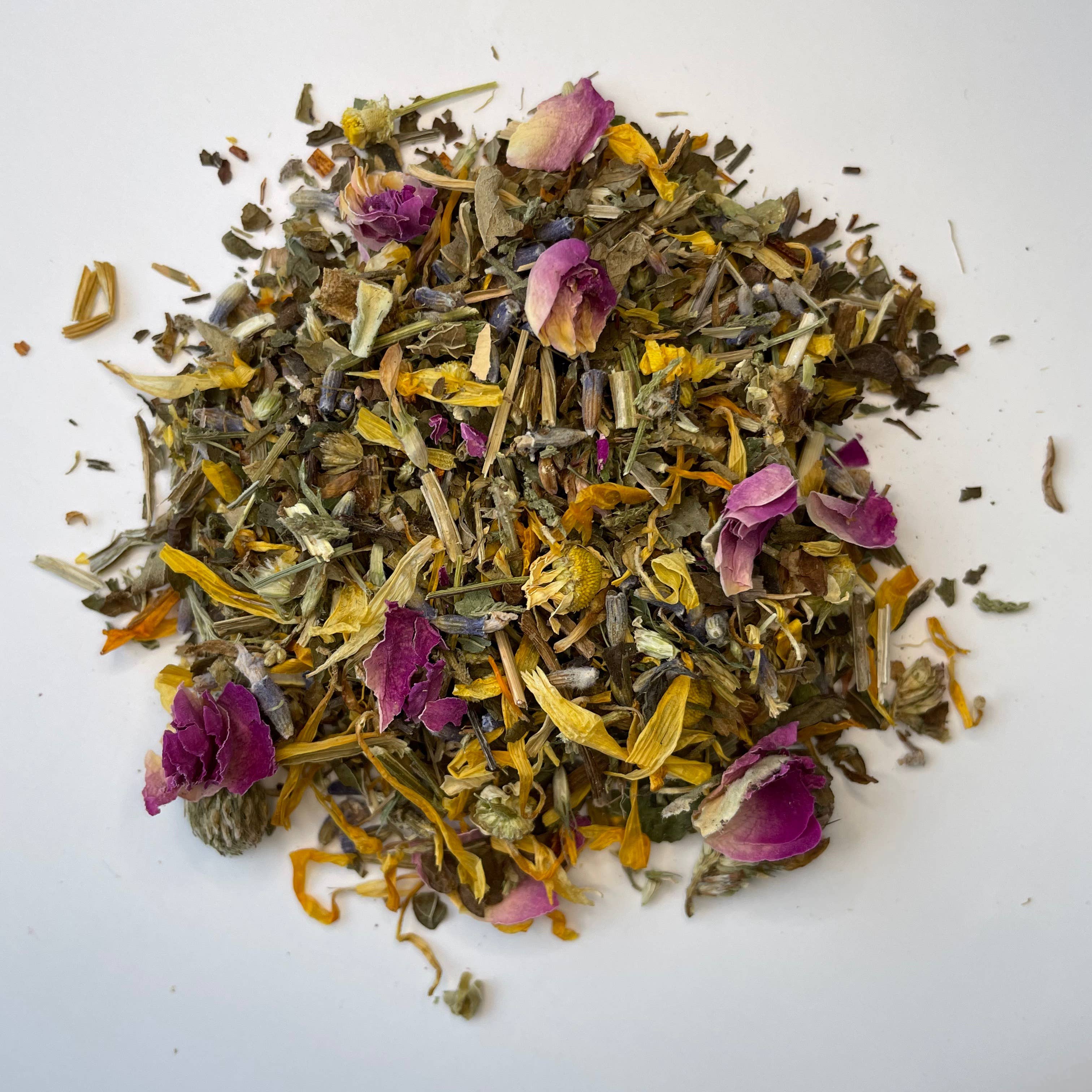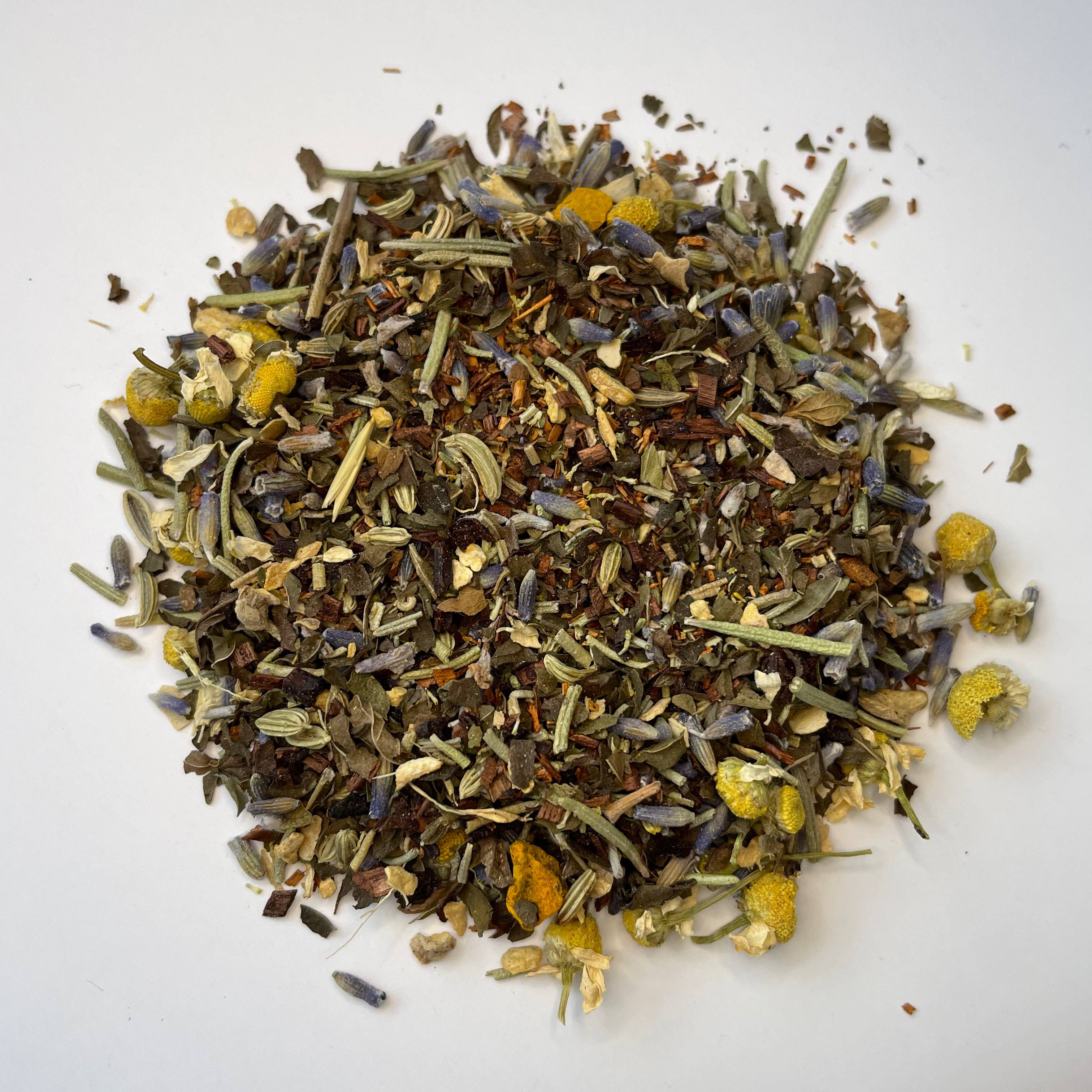 caffeine free herbal tea bright | fresh | citrusy | fruity A unique combination of fruit, spices and mint herbs smell + taste AMAZING! The power of citrus comes from both the inner fruit as well as the peel, so we have utilized both. Keep your immune system strong by enjoying this tea with a lemonade steep + some honey! This is our go-to tea for a soar throat, a cough and cold/flu symptoms. Special ingredient mullein breaks down phlegm in the body, and help attack build up in the respiratory area (making this tea perfect for this scary pandemic time). + cold and flu fighting properties + antioxidants for immunity + reduces sore throat + cough + calms dizziness + vomiting + relieves heartburn + mood boosting elements + safe to drink while nursing Ingredients: ginger, rose hips, apple, chamomile, peach, lemon, pineapple, lemon verbena, peppermint, mullein, spearmint
