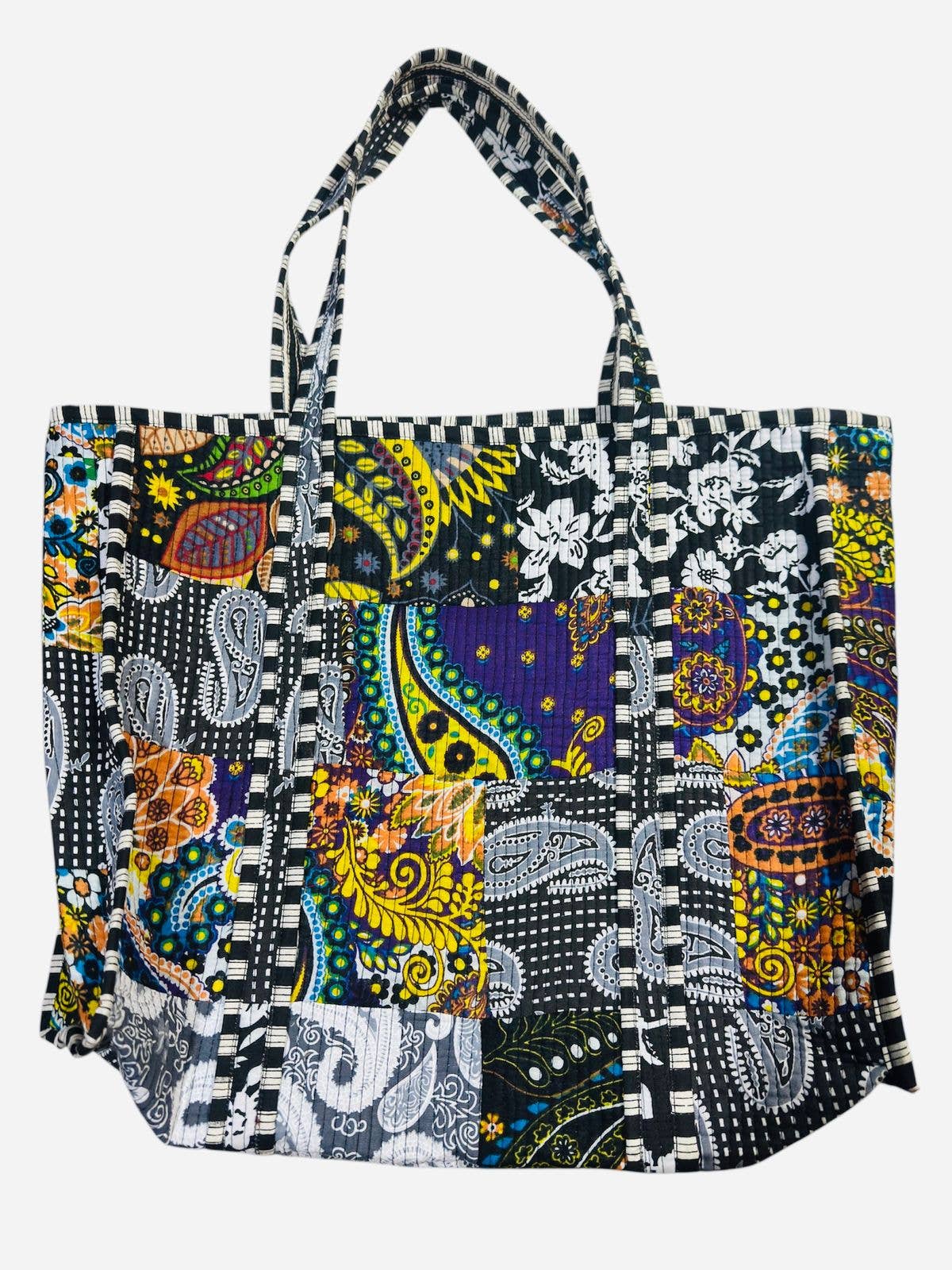 We were tired of the grocery bags we saw in the market and wanted to create something that was a great in style while fully functional and made from only natural fibers. This is a large organic cotton block printed bag and has a small pocket inside. Small and Large handles are both there for easy handling of carrying your groceries from the cart to the car or to your home. This bag is printed by hand on hand woven organic cotton using only natural dyes. The fabric was first woven by the weavers and then printed by master printers. The tassels look cute and also is used for tying the bag into a small ball, so they take minimal space in your car/home. The bag is also good for your clothes for a weekend getaway and great for gifting! PRODUCT DETAILS: - printed by hand using a carved wooden block - hand dyed in natural dyes - color: black & blue - size: 17x20 - has a pocket inside - tassles for tying bag into a ball CARE: Hand wash or machine wash separately on gentle cycle