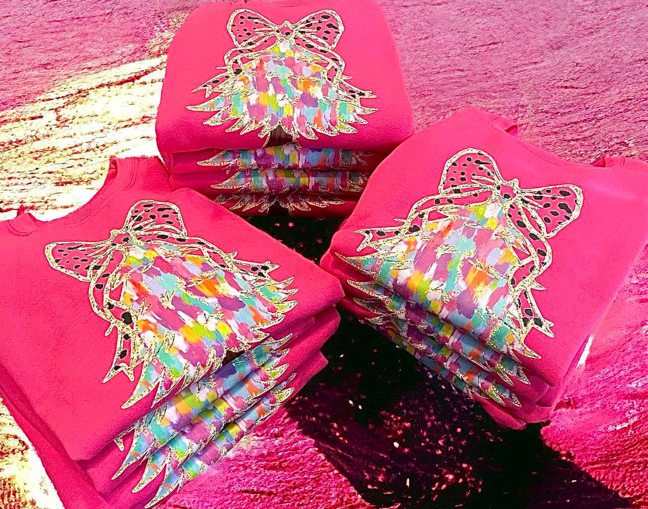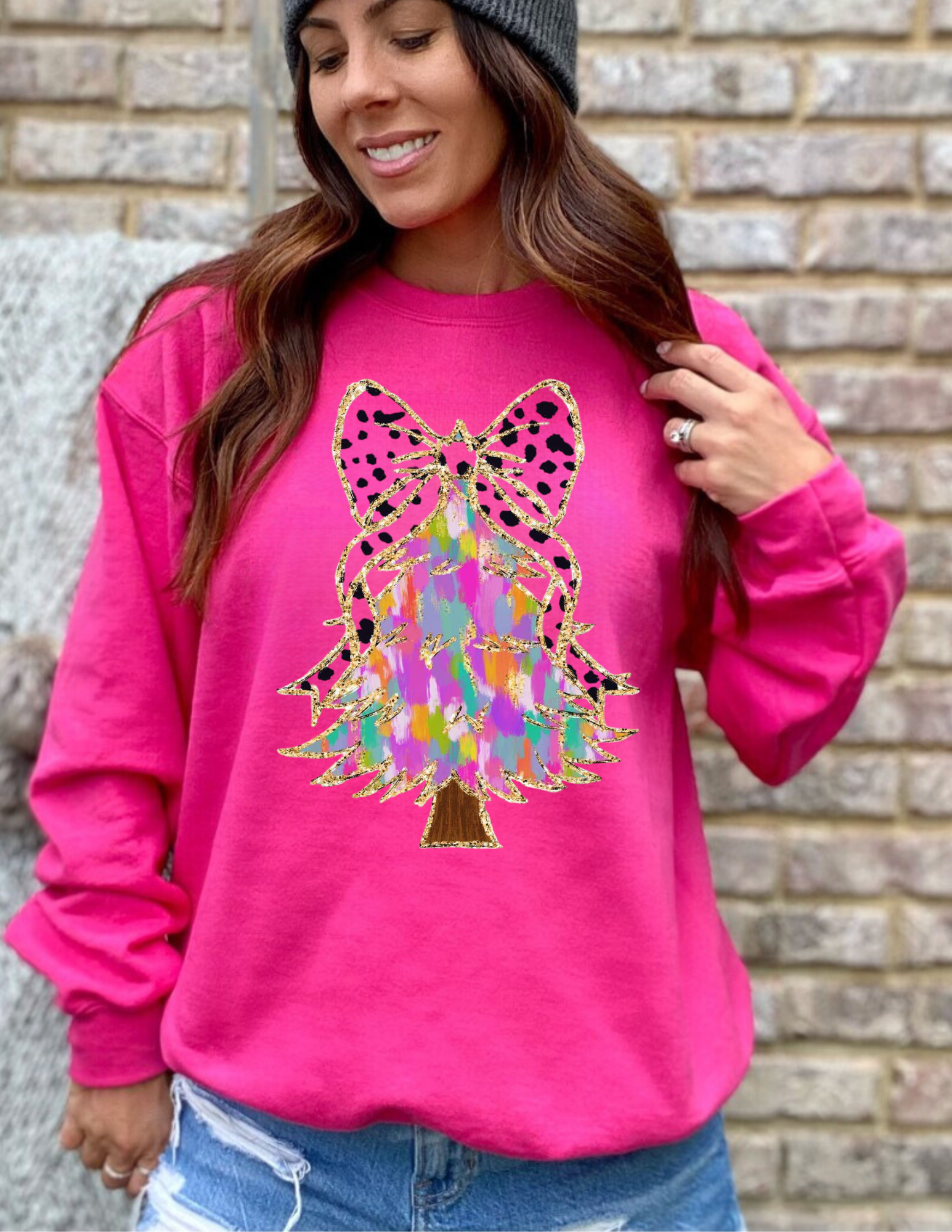 Get into the holiday spirit with our Wholesale Watercolor Christmas Tree Graphic Sweatshirt. Featuring a beautiful watercolor Christmas tree design with faux glitter accents, this cozy sweatshirt is perfect for celebrating the season. Stay warm and stylish with this must-have holiday essential. Gildan Heliconia color, unisex crew neck sweatshirt DTF printed