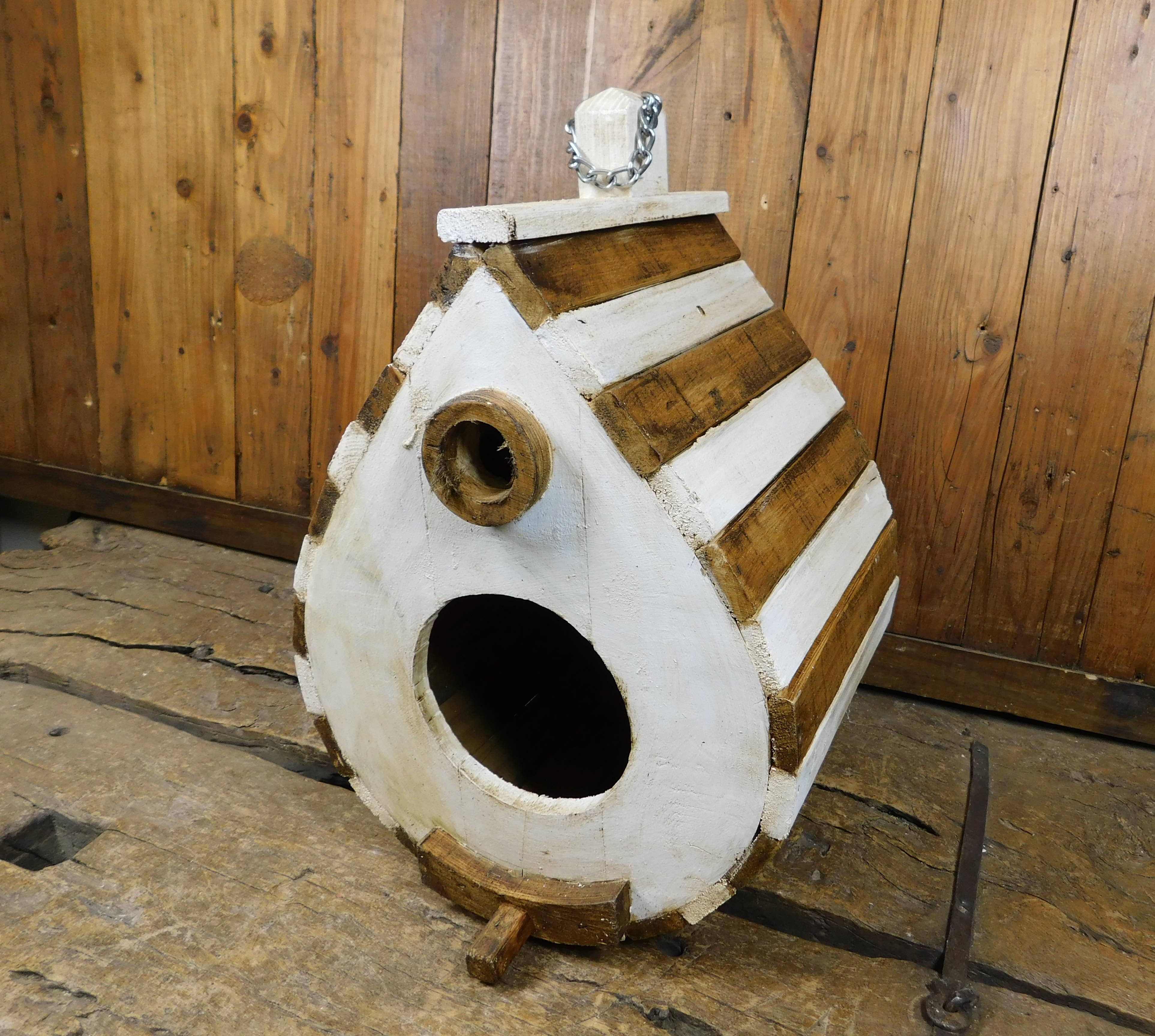 Developed in conjunction with tv’s naturalist and wildlife cameraman Simon King, he watched and photographed wildlife using his many years of knowledge. The design principle is that robins prefer an open-style nest box with easy access but also like to be concealed from the prying eyes of predators. The entrance is open, but the nest space is concealed behind the sidewall and covered by the roof. Robins love to nest in sheds with 24/7 access or porches or on shelves in outbuildings. The nester is lightweight and is wired into a hedge or ivy or attached to a wall using the supplied spare loop of fixing wire. The brushwood nester base has a rattan landing platform with a low dividing wall separating the nesting or roosting space.