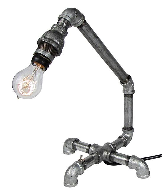 This industrial pipe lamp features a wooden base and comes with 2 elegant bulbs. It includes a valve as an on/off switch. Included is a working temperature gauge. The lamp is constructed from black iron pipe, and all electrical components are UL listed. Each lamp is custom-designed and manufactured in the USA. The cord measures 6 feet in length, and the lamp's dimensions are 18 inches in height by 10 inches in width.