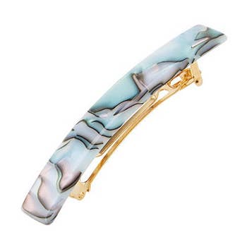 Party Dress French Barrette Get yourself some flowers, order in your favorite foods, and slip into something cute! Whether alone or with others, our Night In collection is here to remind you to make time for the things that make you happy. Clear acetate with colorful streamers contrasted with blue make for a unique yin yang design! *Sold as a single French barrette *approximately 4 inches *made from cellulose acetate. Due to the nature of this material no two barrettes are exactly alike, each one is unique!