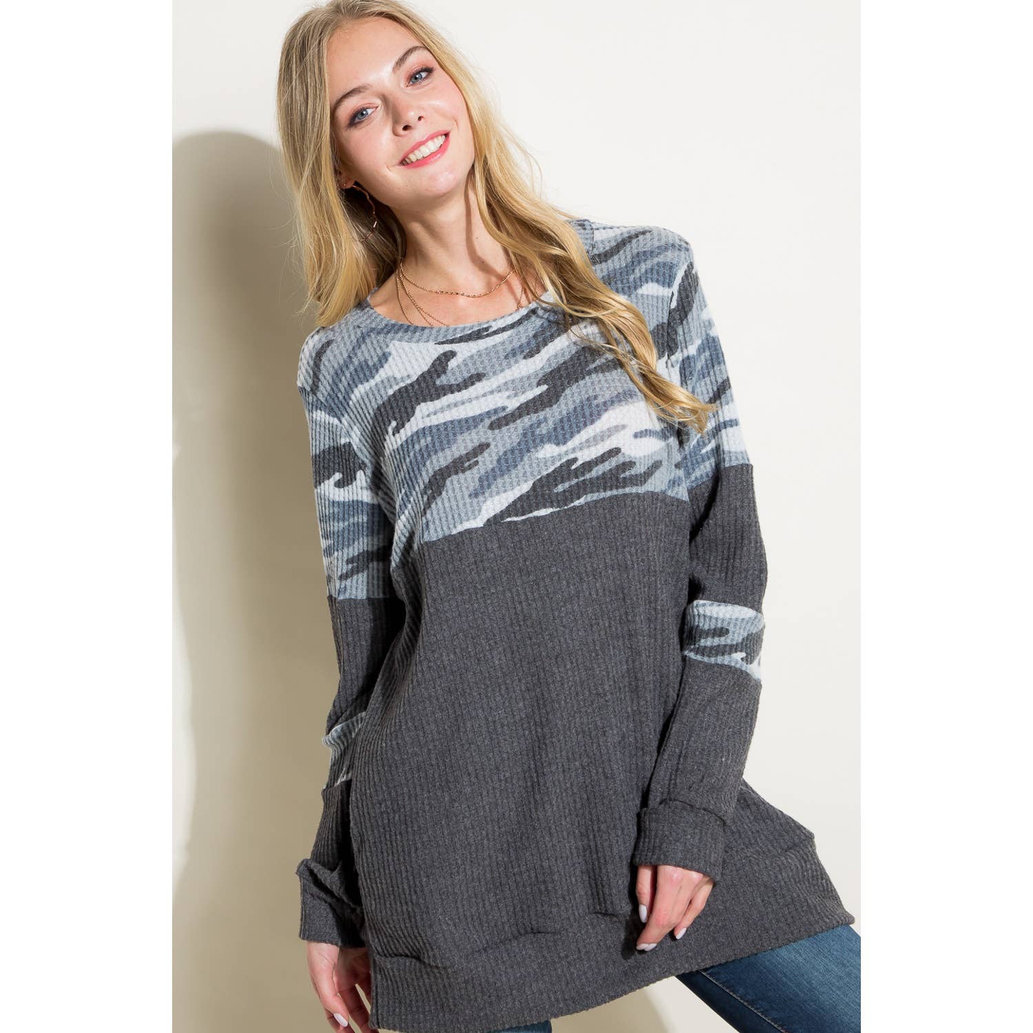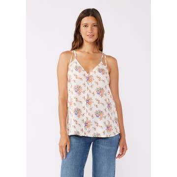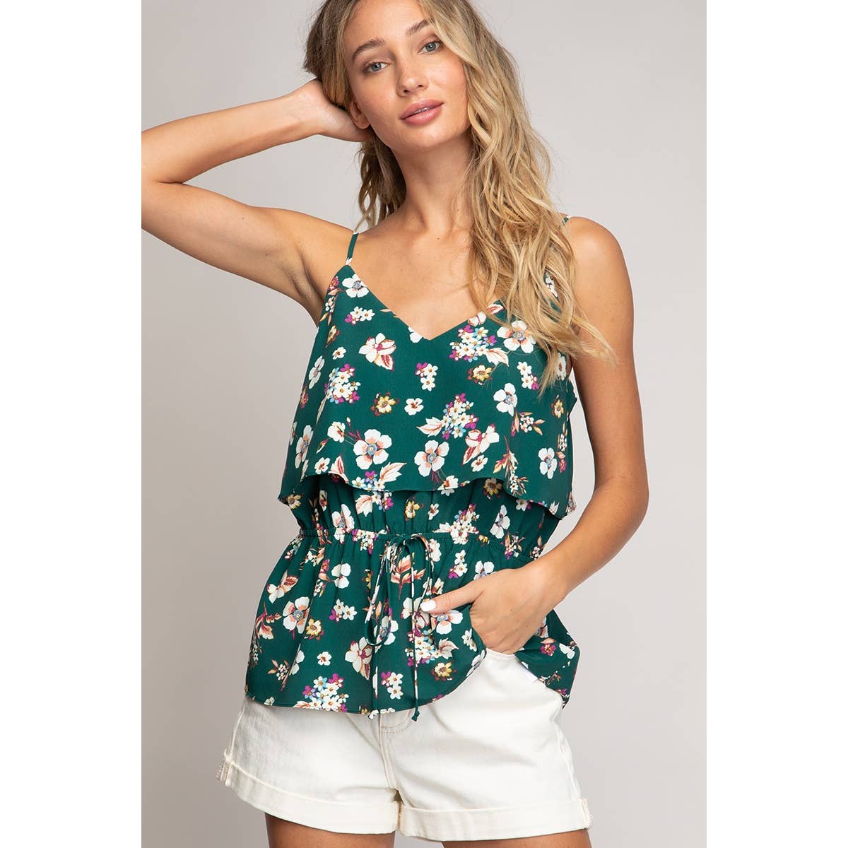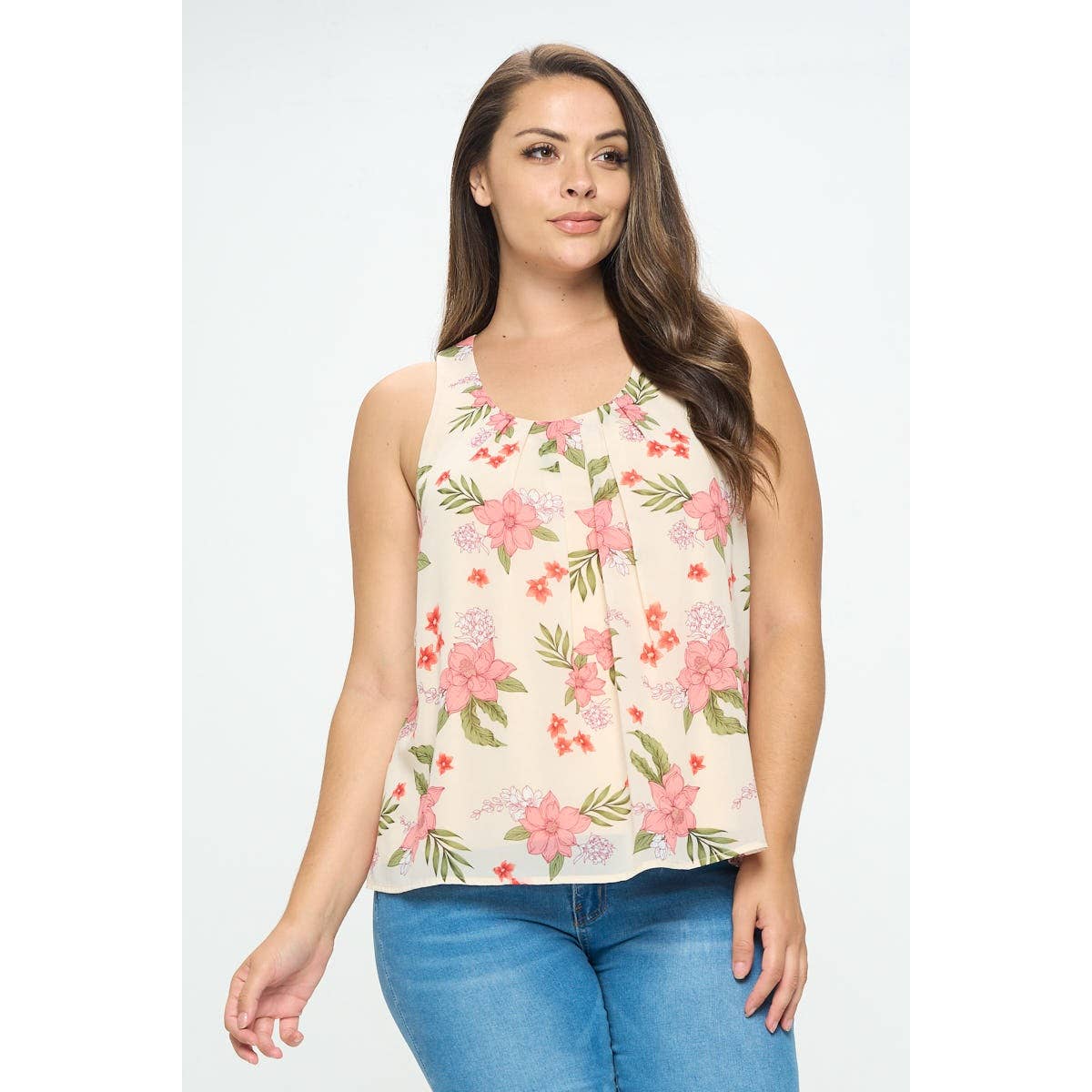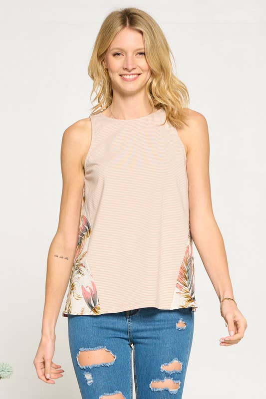 - 1C81051R-4 SLEEVELESS BANDED BOTTOM TOP -V NECK SLEEVELESS -BANDED BOTTOM -FLORLA JERSEY PRINT 95% RAYON, 5% SPANDEX MADE IN USA S/M/L 2-2-2 -MODEL IS 5'9" 34-24-35 AND WEARING SMALL