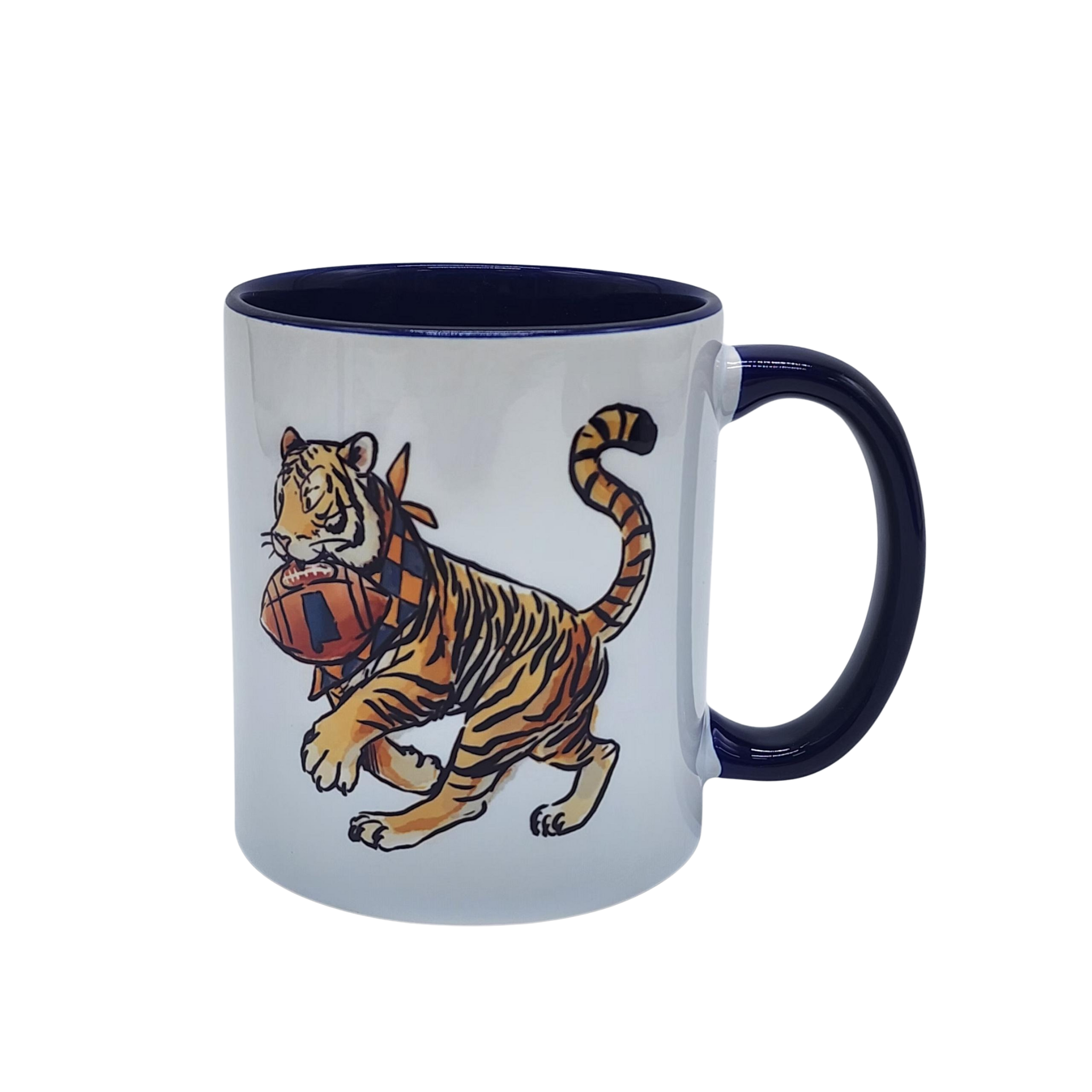Does the Christmas season bring you joy? Are you a Tiger fan? Enjoy both with your morning coffee when drinking from this 18 oz coffee mug that features a Santa hat-wearing tiger. Search Keywords: Cup