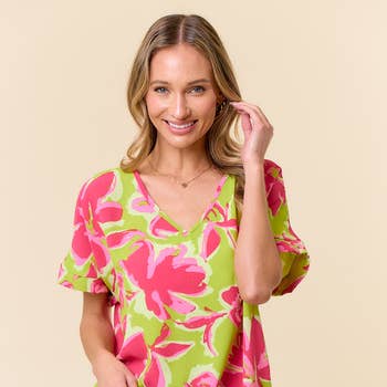 PRINTED WOVEN RUFFLED TULIP SLEEVE V NECK TOP 100% POLY MADE IN USA