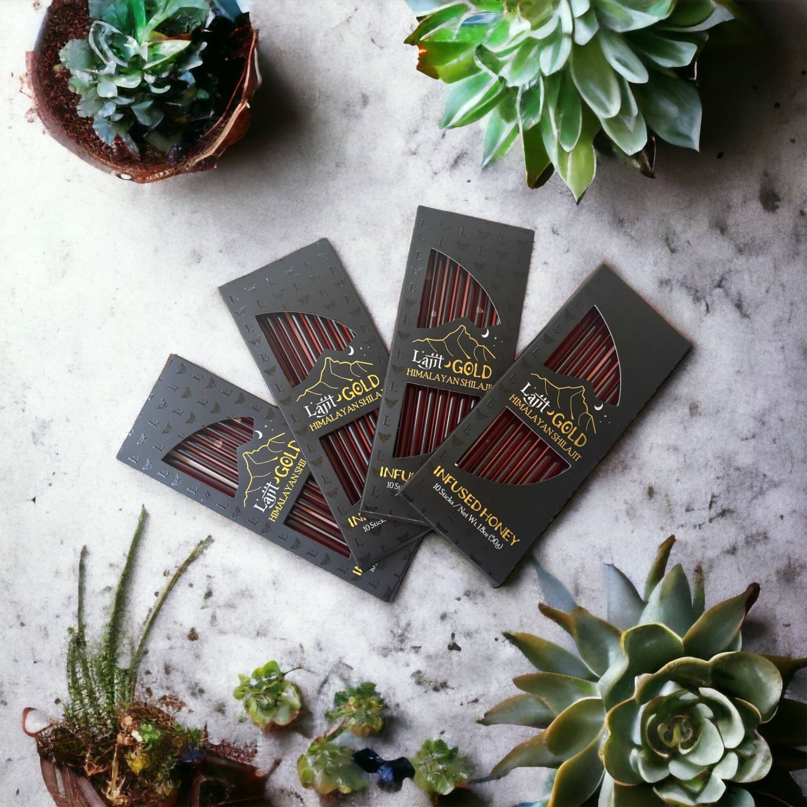 Looking for a natural way to boost your energy levels and support your overall well-being? Look no further than Lajit Gold honey sticks Infused With purified, gold-grade Himalayan shilajit and raw, unfiltered organic honey. Lajit Gold brings together the best of ancient Ayurvedic Medicine and modern nutritional science. The compounds in shilajit stimulate protein synthesis and convert fats and carbs into ATP, the fuel that powers our cells, making it a natural energy booster. Honey and shilajit have been used as master healers by Ayurvedic Medicine practitioners for centuries. Aristotle gave shilajit and honey to Alexander The Great and his men to improve their stamina and performance. So whether you're looking for an afternoon pick-me-up, a preworkout boost, or a natural way to support your immune system, Lajit Gold Honey Sticks are the perfect choice. They're easy to use, delicious, and packed with nutrients to help you and your customers feel your very best.