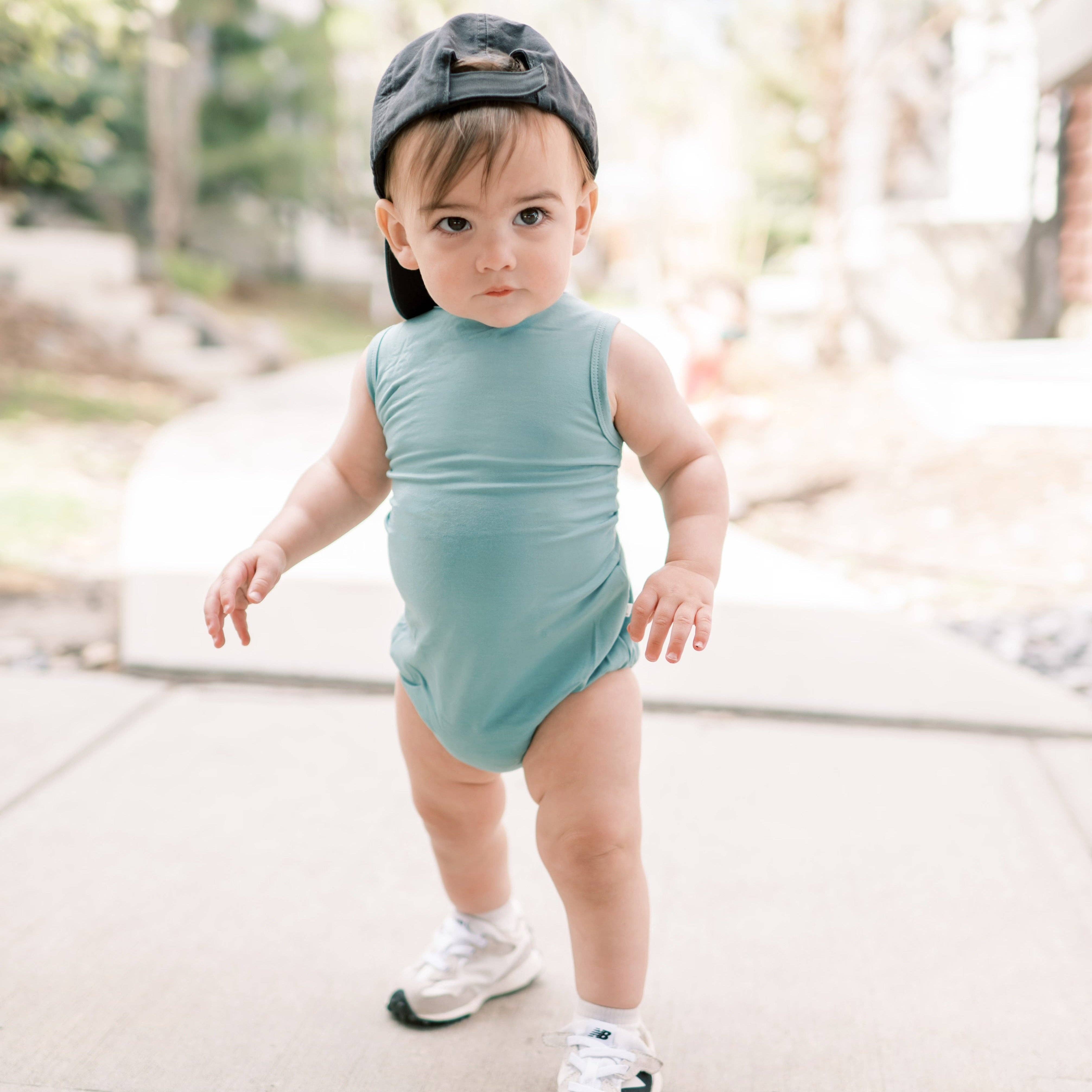 Crafted from soft and sustainable bamboo, this Bubble Romper is perfect for warm days with its breathable and lightweight fabric. Featuring a convenient snap closure at the shoulder and diaper, making dressing and changing a breeze. - 95% bamboo rayon, 5% spandex care Machine wash cold. Wash with similar colours and hang to dry. Please note we have a measurement tolerance of +/- 1/2".
