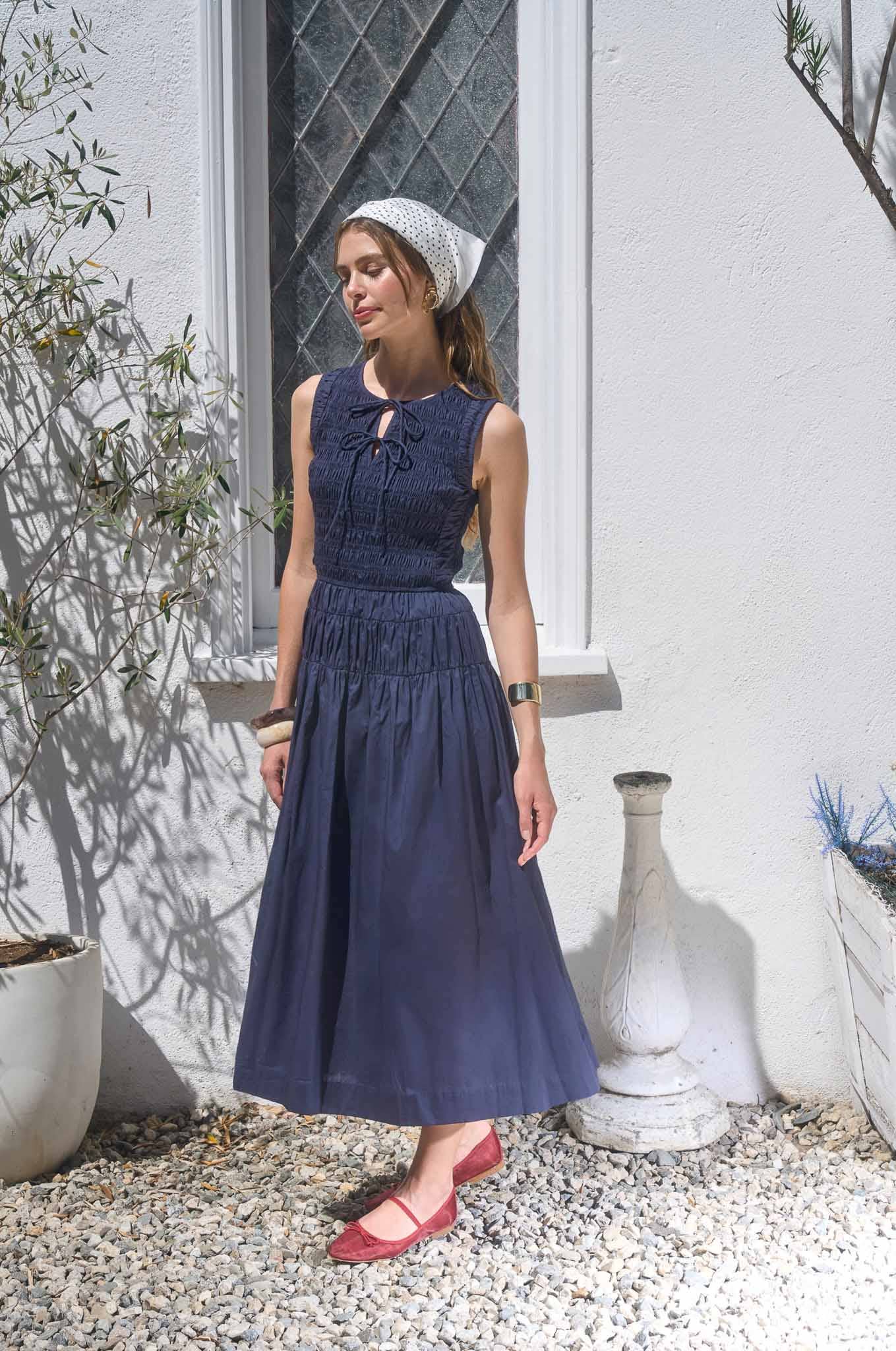 100% Cotton | Mineral washed cotton drill slub with cotton voile lining | Side seam pockets | Floral embroidery on bodice | Modesty panel featuring snap closures for ease of fit | Button tie back waist | Tonal pencil piping on bodice | Full, elbow length sleeves with elastic flounce cuff | Phoebe is 5'9" and wearing a size small dress measuring 47" | Textile tip: The mineral wash process creates variegated and uneven colors intentionally as part of its beauty. Colors may vary from piece to piece. | Machine wash, separately in cold water. Hang to dry. | Proudly Made in India