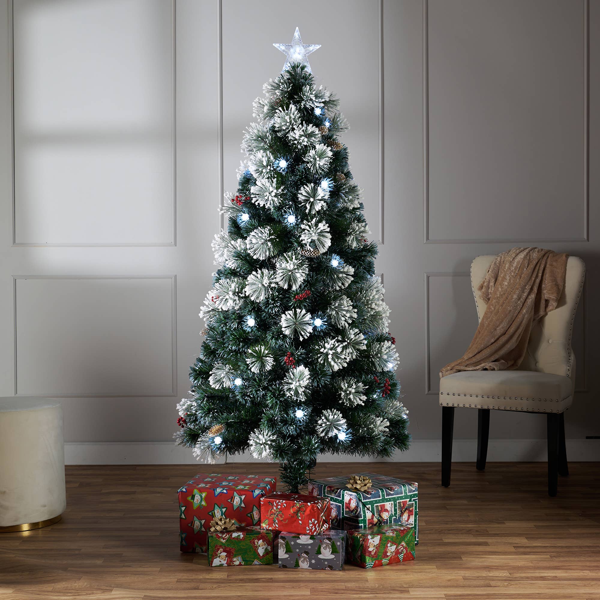 Bring the outdoors in with this rustic snow dusted Oregon Fir tree. Each branch features full needles, lightly frosted for a snow kissed look. Nautural pinecones are scattered throughout and also gently frosted. A sturdy black metal stand secures the tree. Tuck into an oversized basket and decorate with charming white and black ornaments for a modern farmhouse feel.