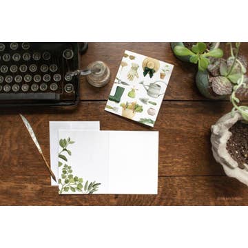 Celebrate the beauty of nature and culinary inspiration with this elegant card featuring a detailed watercolor illustration of herbs: basil, cilantro, rosemary, thyme, and sage. Perfect for garden enthusiasts, chefs, or anyone who appreciates botanical art, this versatile card is ideal for thank-you notes, birthday wishes, or special messages. Printed on premium-quality cardstock, this card comes with a matching white envelope and showcases a timeless design that adds a personal touch to any occasion. Whether displayed as art or sent as a heartfelt note, it’s a charming addition to any stationery collection. Stock up for your boutique or gift shop with this popular botanical-themed card, a proven favorite among nature lovers and foodies alike * A2 card 4.25" x 5.5" * Card is blank inside with white envelope * Single cards are individually packaged in a clear sleeve * Boxed sets of 6 are packaged in a Kraft box with envelopes - ready to be gifted Original artwork created by Liz Pope.