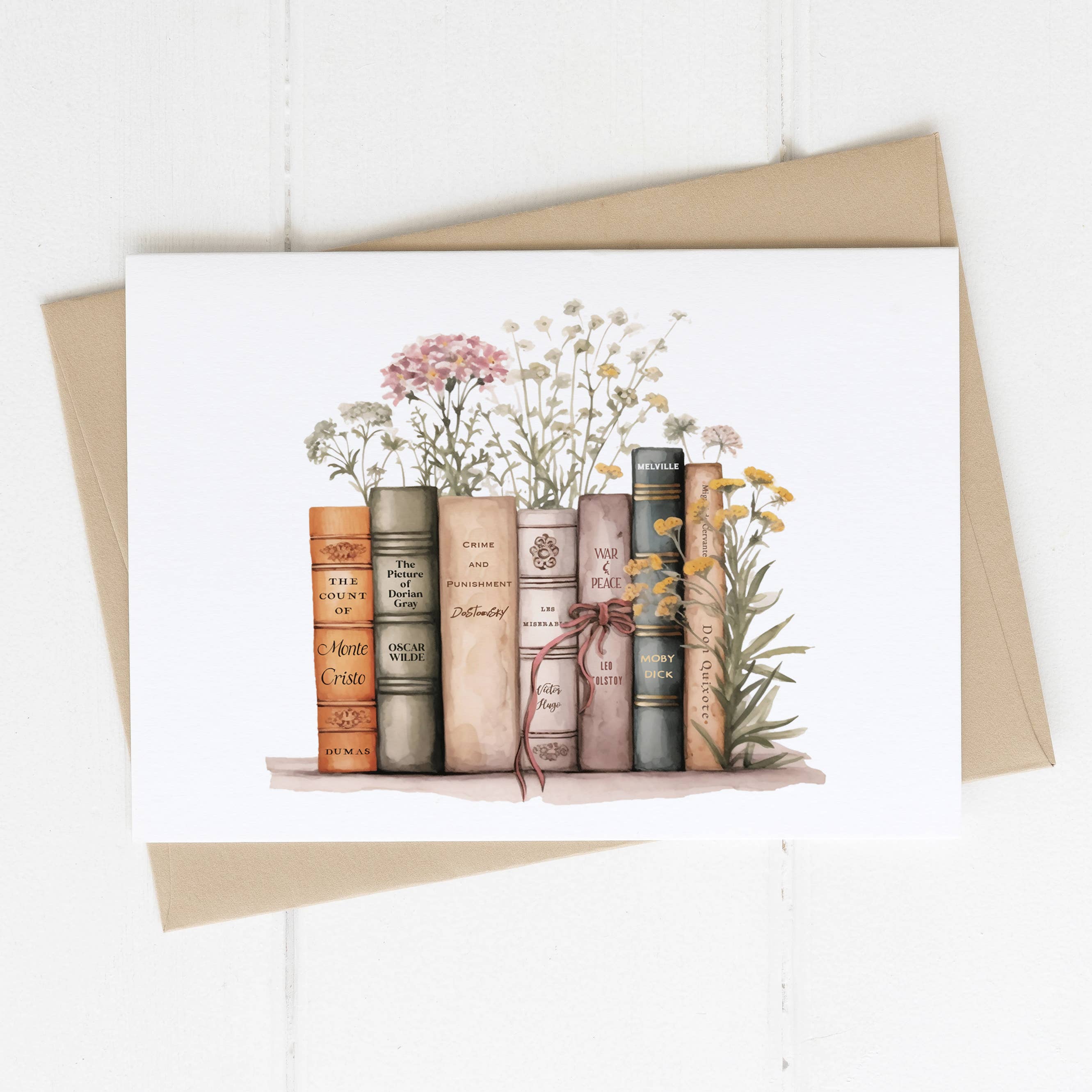 Share the literary love with this William Shakespeare book stack card. The watercolour style stack features the following popular Shakespeare books: The Tempest, Macbeth, Hamlet, Othello, The Taming of the Shrew, A Midsummer Night's Dream, King Lear, Much Ado About Nothing, Twelfth Night and Romeo and Juliet. The card comes with a kraft brown envelope and the inside is left blank. Material: Our greetings cards are totally eco-friendly. These are printed on thick 270gsm premium recycled card, which has a finely textured matte surface. Envelopes are 100% recycled, vegan friendly kraft brown with a triangle flap. Please note that recycled materials are not uniform and therefore the colour and texture can vary slightly from product to product. We think this makes our items even more unique. Our greetings cards come packed in plant based compostable and biodegradable clear bags. Dimensions: Portrait A6 (148mm x 105mm)