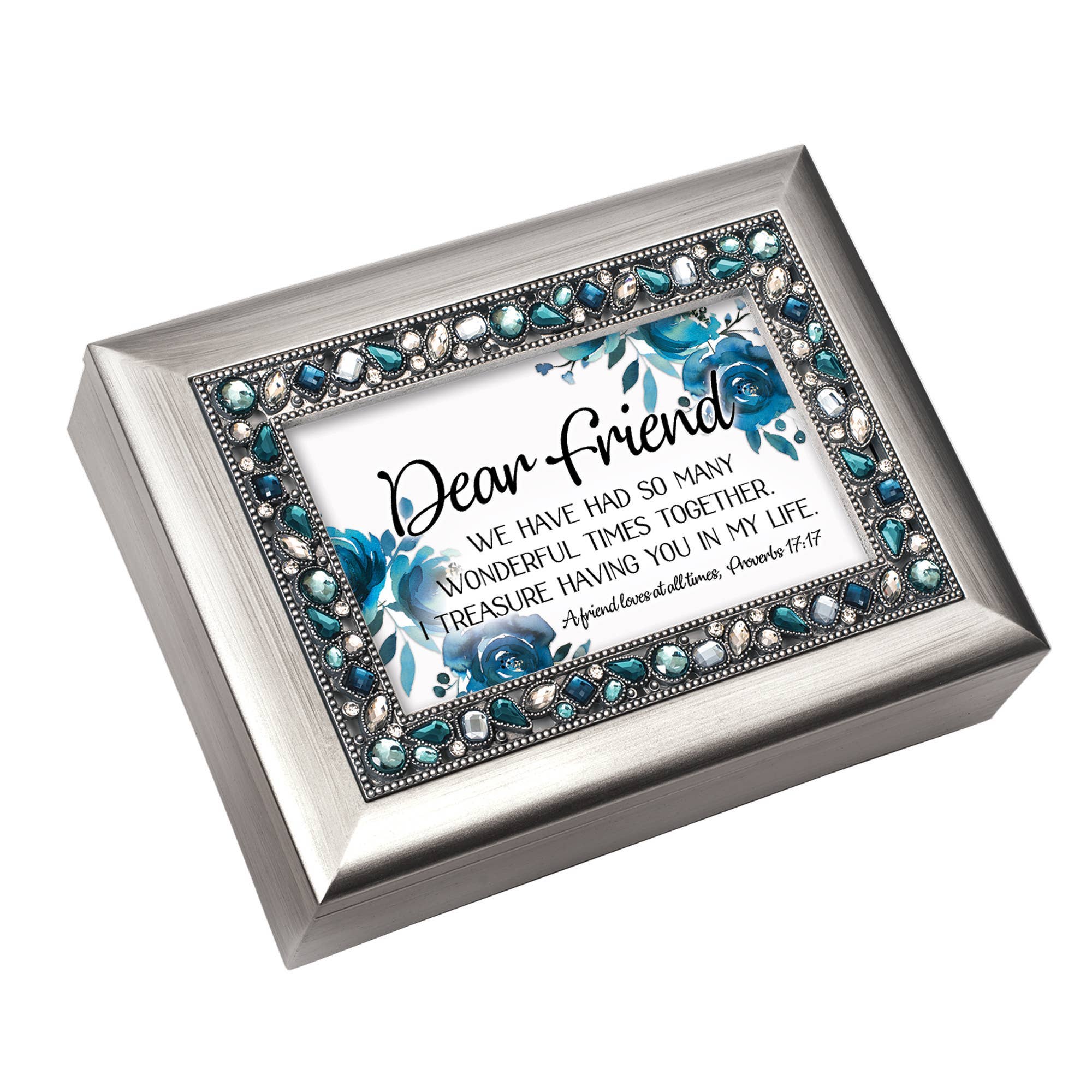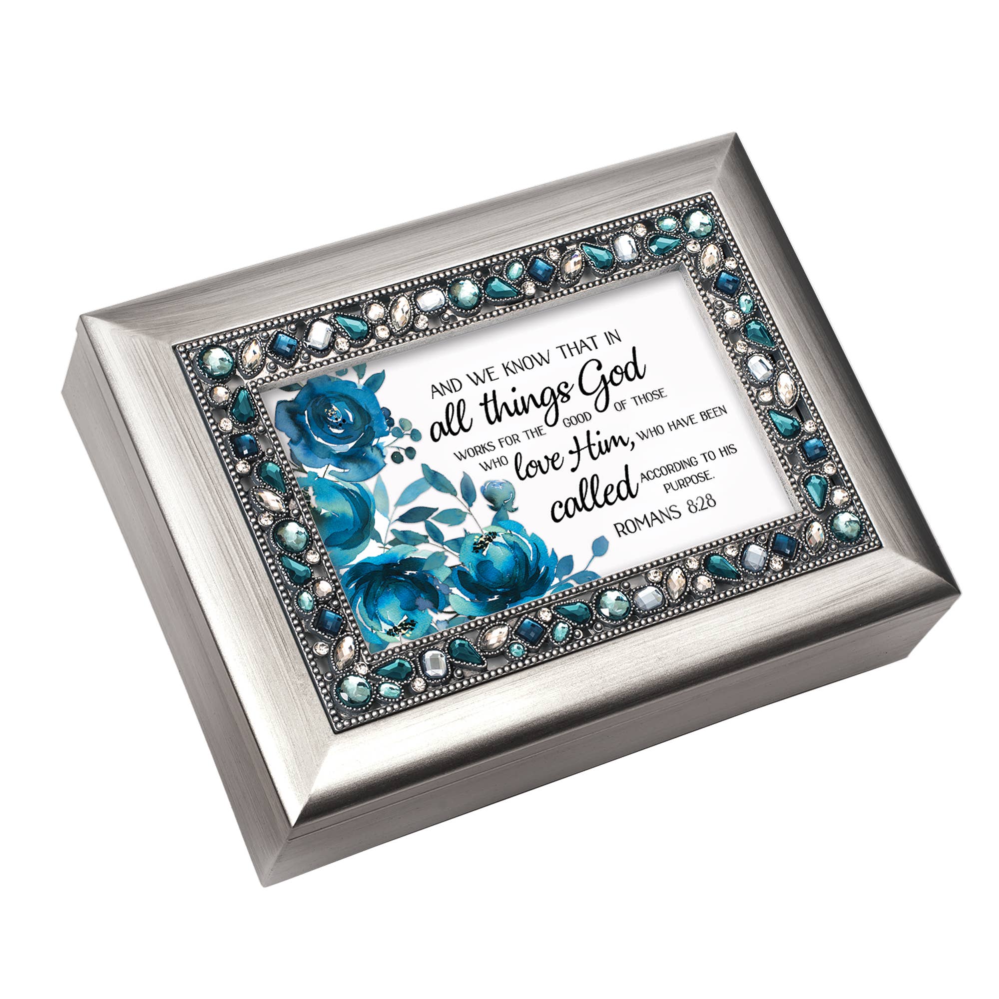 Sparkling stones in blue, teal and clear are set in a dainty beaded antique silver trim on this gorgeous keepsake box. Edges of lid and sides of box have a soft metallic silver brushed finish. The hinged lid is also a photo frame; it comes with a lovely art print, under glass, with sentiment. Print can easily be changed out for a favorite 6x4 photo. Inside box is a small compartment with clear glass top that shows the high-quality Sankyo musical movement. When key under box is wound, music will play when lid is open and stop when it is closed. Plays the song: Amazing Grace. Storage compartment has a luxurious black velvety lining. Matching decorative legs on bottom are padded to protect furniture. Box is made of a super-sturdy polymer that resists cracking and chipping. Overall size is 8 x 6 x 2 5/8.