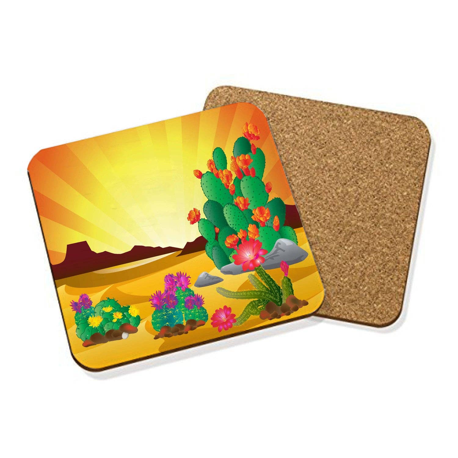 These cork-backed coasters feature glossy white hardboard tops. The designs are heat-set, resulting in rich colors and a smooth finish. Specifications: Size: 4" x 4" Thickness: 0.125" thick MDF cork back