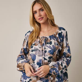 Round neckline, floral printed long sleeve top. Featuring a ruffle trim on neckline with an adjustable tie. Model Size + Fit: Model height: 5'11" Dress size: Small Bust: 31.5 Waist: 23.5 Hips: 35