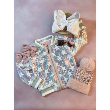 A classic denim jacket in mid-blue with 4 pockets and button fasteners. Customised with a sparkly sequin star measuring 24cm across. Personalise by adding a name or initials (max 9 letters on back or 3 on front left chest). About Our Denim Jackets All our jackets are customised to order in our London studio and are completely bespoke to your design Orders will be dispatched within 5 working days Content + Care 100% cotton in good quality weight of denim 4 pockets and metal rivet button fasteners Machine wash at 30 degrees Size + Fit The jackets come true to size. See size chart for detailed measurements.