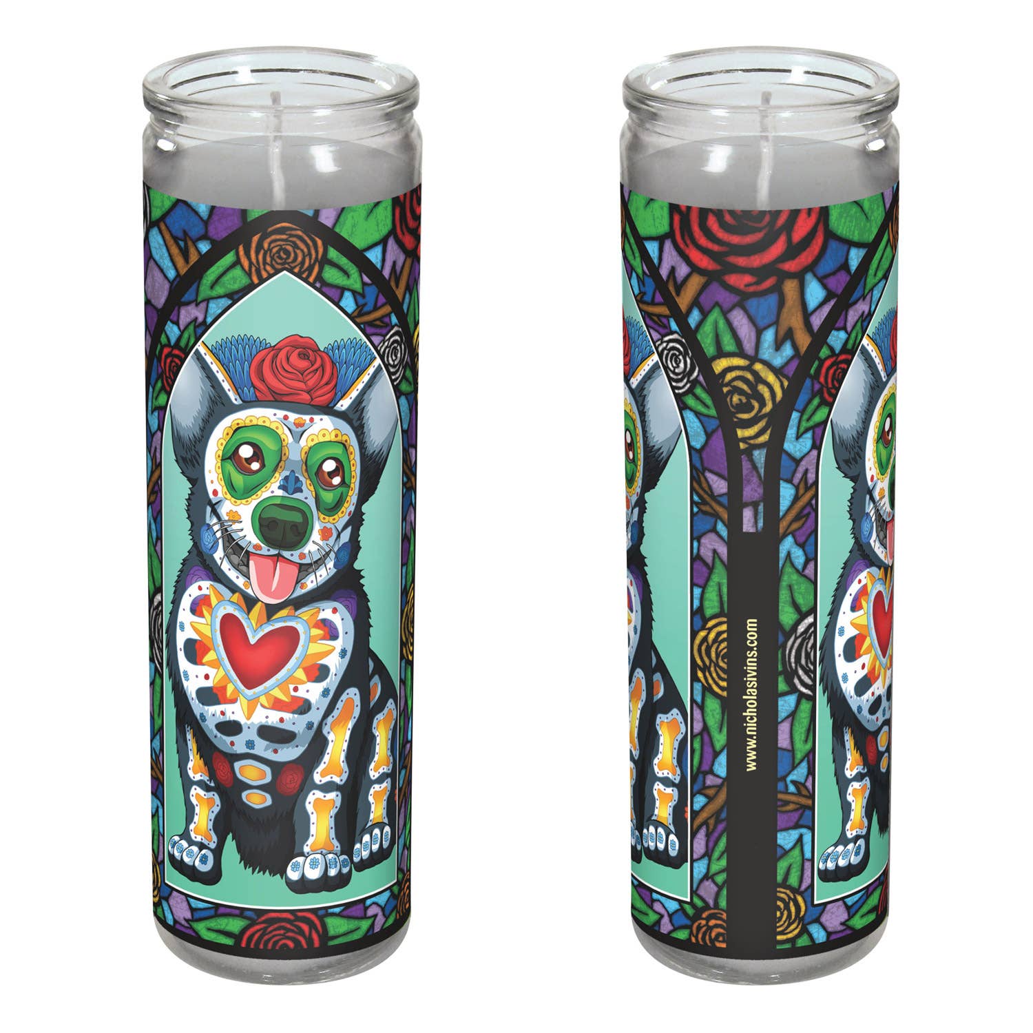This high quality pillar candle features the eye-popping artwork of Nicholas Ivins. Printed with vivid high-quality inks. Candle measures 8″ tall and 2.25″ wide. Wax is unscented and color may differ from photo. © Nicholas Ivins. All rights reserved.
