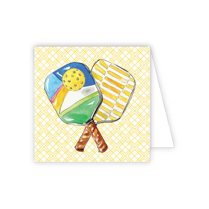 Our Pickleball Gift Enclosure is printed and hand-glittered in Memphis, TN. Hand crafted artwork, full color ink printed on natural white paper, and paired with a vellum envelope. Book-folded enclosure card, blank on the inside. Paper color | natural white. Envelope color | vellum. Print process | full color + letterpress Embellishment | gold foil Dimensions | 3 x 3 inches.