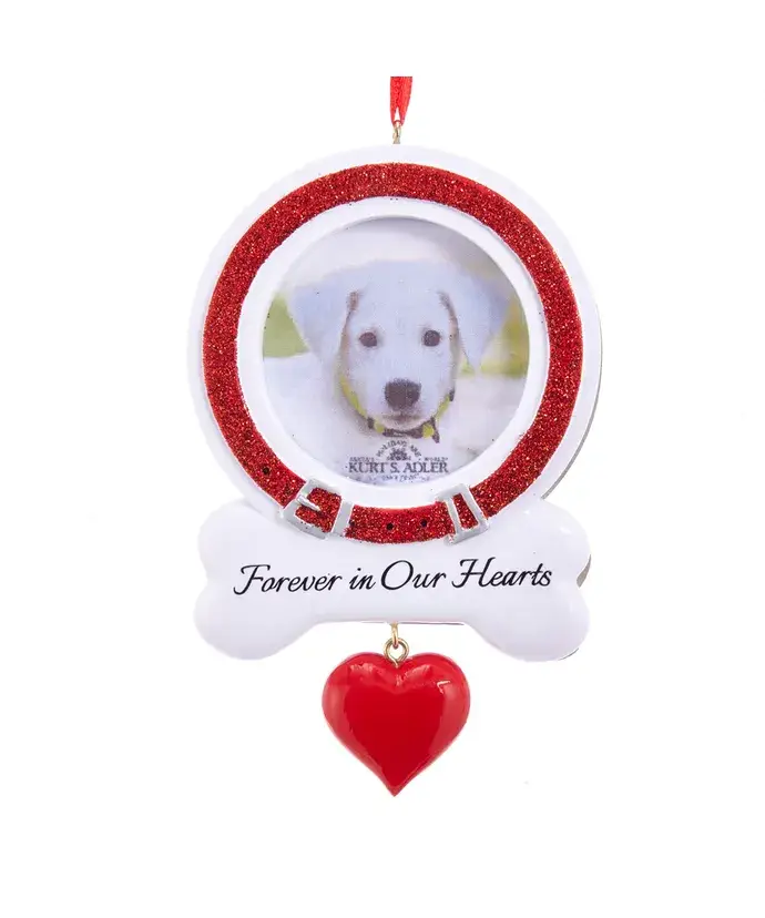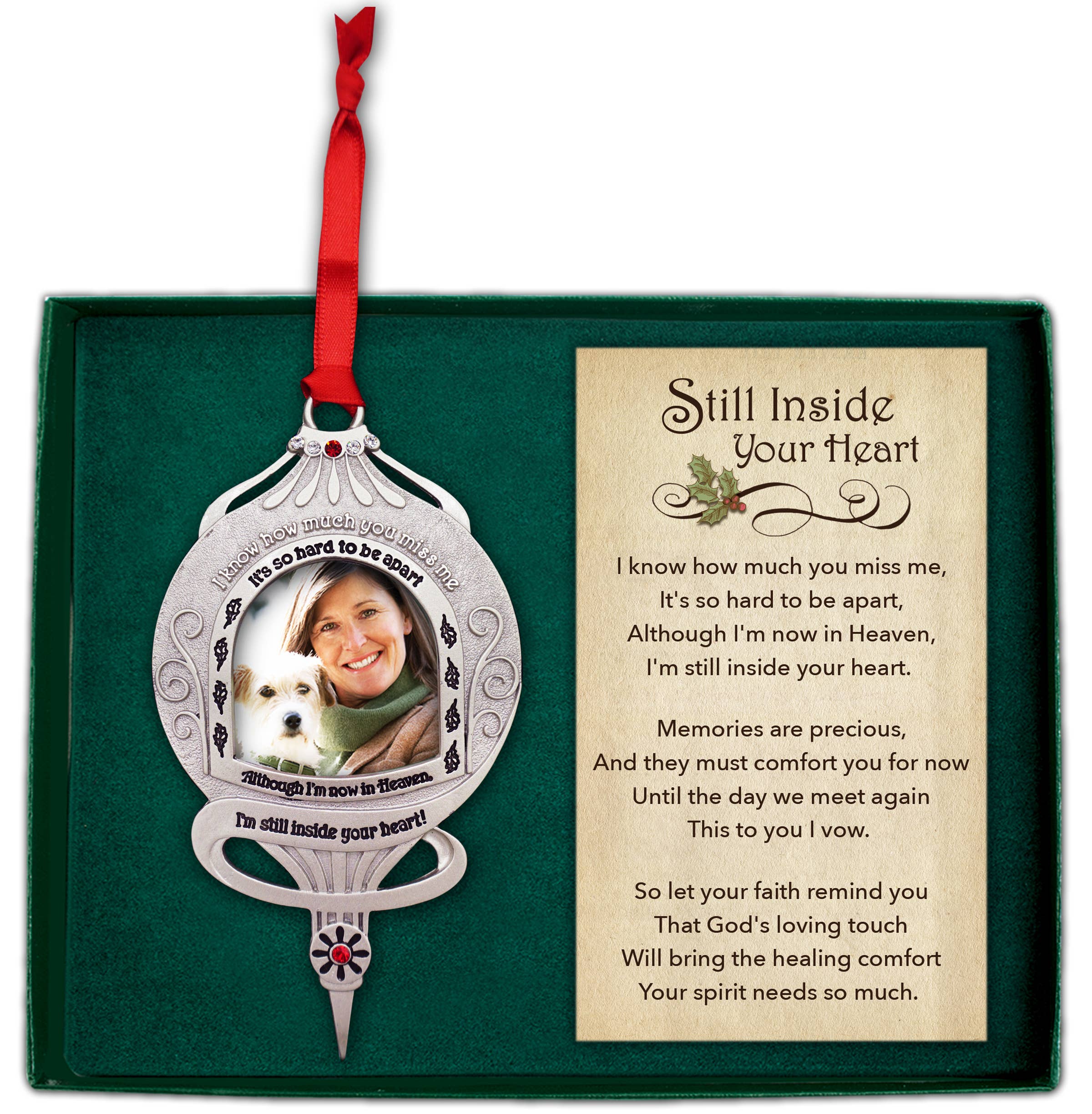 Beautiful metal cast pawprint-shaped memorial ornament for the loss of a cat or a dog. 3x3.5 inch double-sided design features a red heart and a "Pawprints Left by You" sentiment. This ornament hangs from a black ribbon and is a touching reminder of a dear companion. It can be hung year-round in a car, home, or office or saved for a holiday tree. The ornament features a heart-shaped photo charm for a dog or cat's photos. Holds a 7/8” sized photo. The pet ornament is wonderful as a car rear view mirror charm displayed on a hook, knob, or ornament stand, or taken out each Christmas as a tree ornament. The timeless keepsake will always remind you of the special friend no longer with you. The ornament comes packaged in a craft box with the entire "Pawprints Left by You" poem. An appreciated gift for anyone suffering the loss of a beloved pet.