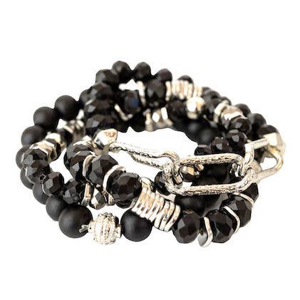 Black leather and silver colored donut beads wrap around bracelet.