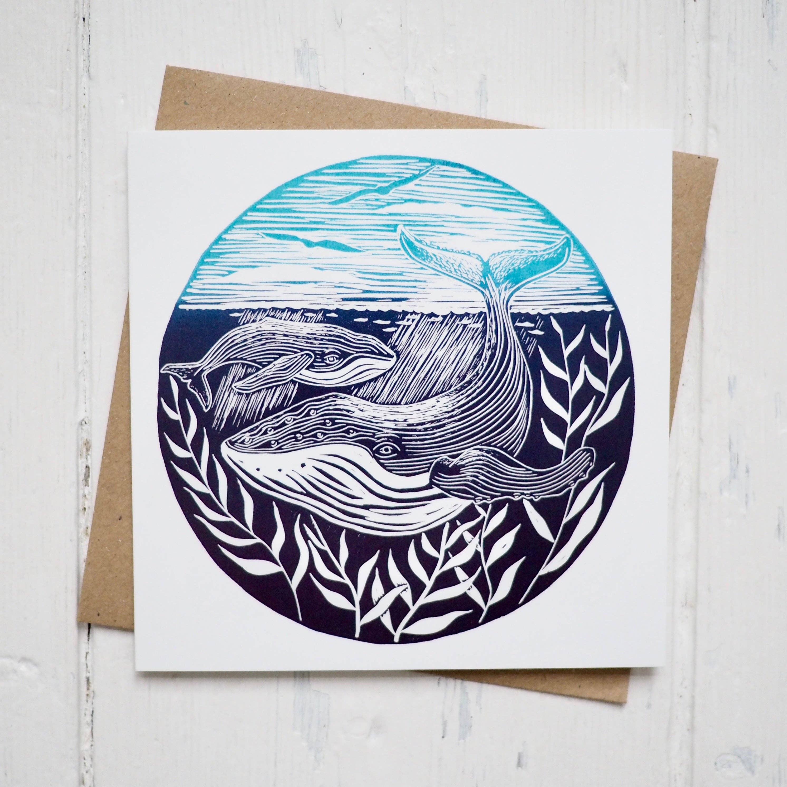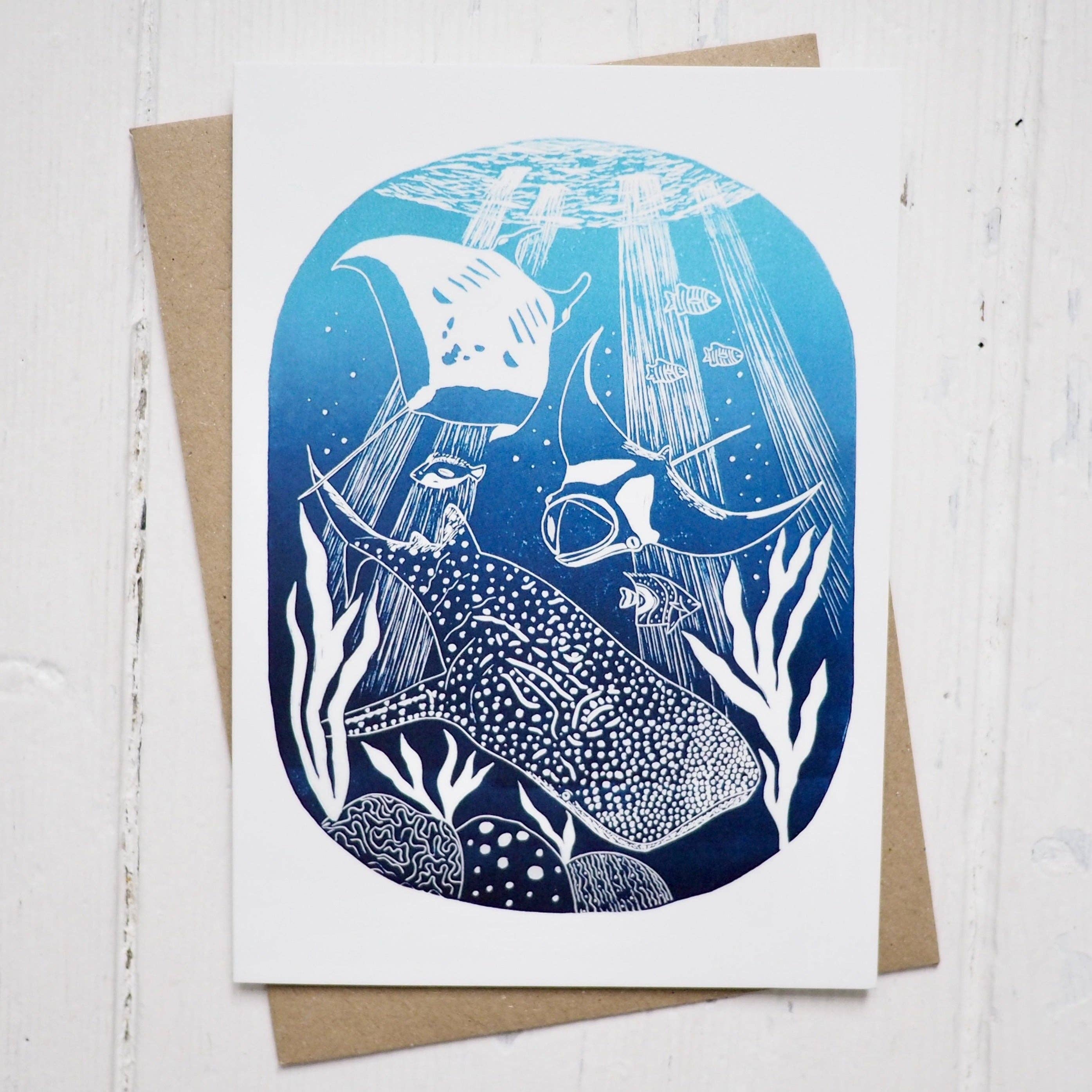 Jellyfish Lino Print Greetings Card A beautiful greetings card perfect for any occasion. This is a digital reproduction of my lino print featuring a whole bloom (or smack, apparently!) of beautiful jellyfish. Inspired by the huge barrel jellyfish spotted off the Devon and Cornwall coast this summer. The cards are blank so that you can add your own message. Printed onto quality white 300gsm card stock. Cards come with a kraft envelope. Card size: 5 x 7" If you love this design, check out the original artwork here