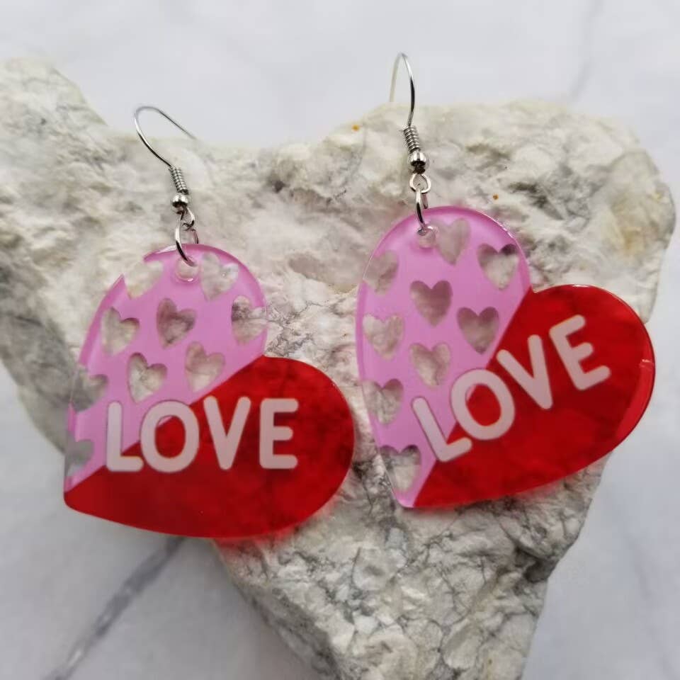 Created with lux pearlescent baby pink cellulose acetate with red painted detailing, polished to a glossy finish Heart locks are 1.25" wide Rhodium plated huggie hoop earring clasps Don't forget the matching necklace and bag charm -available as a bundle deal!