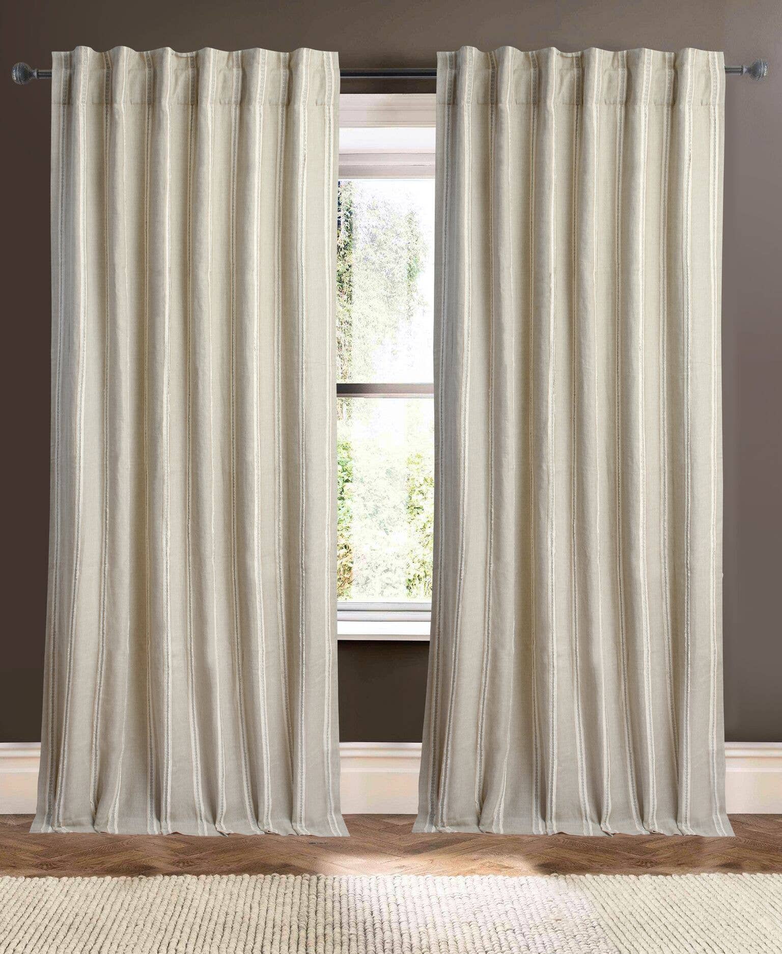 Pure linen sheer curtain with fraying treatment all over. One of the most popular curtains, always a sold out at India’s Heritage. Available in 3 colors- Natural, Grey and White. The fraying gives a funky bohemian look and a classy, unique addition to your room. • Curtain style: Unlined sheer window panel • Material100-percent Linen • Construction: 4-inch Rod pocket and 4-inch Hidden Back Tabs • Weighted hem • Tiebacks included: No • Care instructions: Machine wash warm Dimensions: • 51 inches wide x 84 inches long • 51 inches wide x 96 inches long • 51 inches wide x 108 inches long