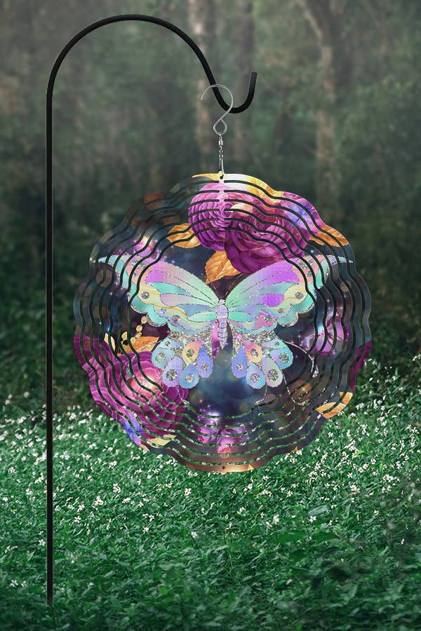 Take delight every time the wind blows with this creative embossed metal butterfly pinwheel wind sculpture as it spins and twirls with the breeze. The mesmerizing movement of the butterflies rotating around the center bearing creates a relaxing, hypnotic experience. The metal construction and brightly painted multicolor finish resist the weather, and the step-on base easily pushes into the ground to provide a stable anchor in most environments. This 71-inch tall, 30.25-inch diameter, 4.25-inch thick inch wide kinetic sculpture is easiest to install in moist soil. Catch the wind, spruce up the yard and create a relaxing outdoor oasis where you can sit back and enjoy a mesmerizing kinetic show powered by nature.