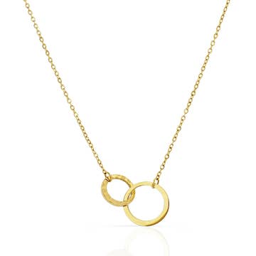 A good friend in your life deserves something pretty for her birthday! Celebrate another 365-day cycle around the sun with a perfect gift for her. Featuring interlocking circles pendant, representing unity, protection, gratitude, and strength. A high-quality piece of jewelry for everyday wear. A necklace that she will treasure for many years to come. -All components are handmade with 14K gold vermeil & sterling silver. A high-quality piece of jewelry that she will treasure for many years to come. - Each pendant is textured by hand, creating a uniquely beautiful hammered finish that reflects light and sparkles with each movement. Every pendant has its own distinctive texture, no two are the same. - Necklace is 18” long with an adjustable ring at 16”. - Pendant measures 1.7" in width and 0.65" in height. - Beautifully packaged in our custom-designed jewelry box with a blank greeting card and jewelry care instructions.