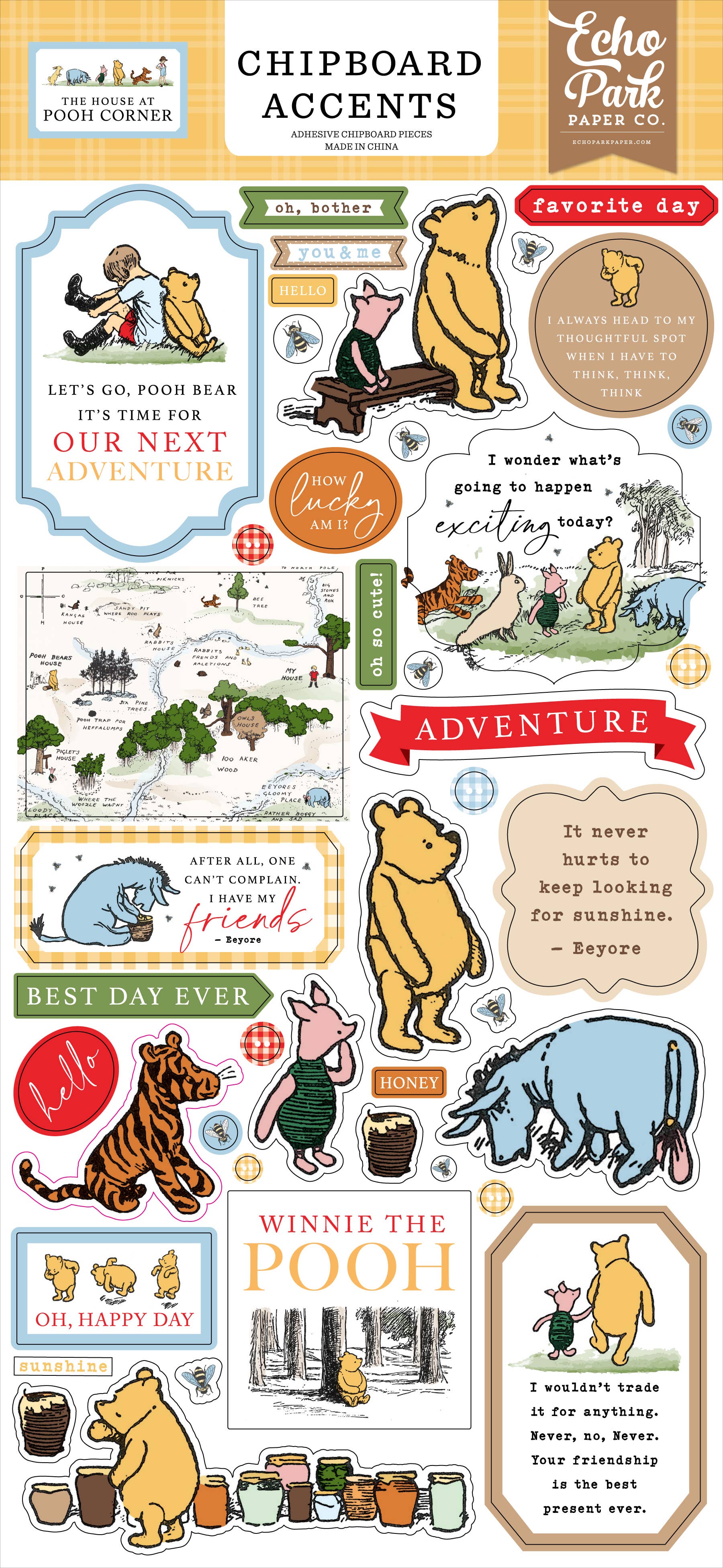 The House at Pooh Corner - January 2025 Ephemera Die Cut Cardstock Pack. Pack includes 34 different die cut shapes ready to embellish any project. Package size is 4.5" x 5.25" Ephemera packs are sold in sets of six. Price shown is for six. MADE IN THE USA Suggested Retail Price is $4.99 per piece.