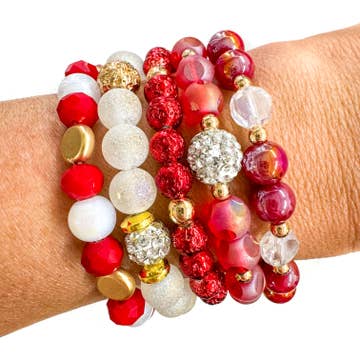 We have done all the mixing and matching for you with our Amanda Bracelet Stack college jewelry collection. We took our best-selling team color bracelet lines and curated them into three different college bracelet stacks. The bracelets are all stretch bracelets which is versatile and fits any wrist. All items are made from zinc alloy and are sealed with a anti-tarnish coating. Each piece is designed and assembled by working moms and grandmothers at our production office just outside Tulsa, Oklahoma. Some components are Made in China then assembled proudly in the USA.