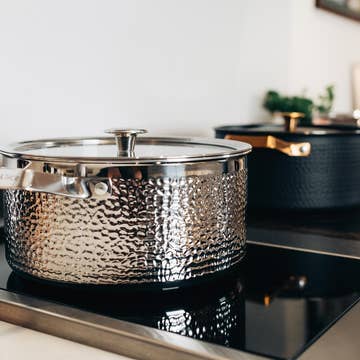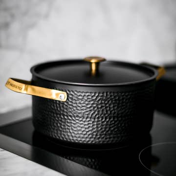 MIO – Sleek, versatile, and timeless MIO is a spacious 4-liter pot from Vargen & Thor, designed to combine functionality with exclusive aesthetics. The hammered matte black finish paired with elegant brass details creates a timeless visual balance and complements other models in the ARVET collection, such as Mandus.2, VIGGO, Model X3, or the frying pan Model Xb. With its refined surface and robust construction, MIO performs beautifully in the kitchen while also standing out as a stylish element on the stove or dining table. Features & specifications • Capacity: 4 L (4.5 L to rim) • Diameter: 24 cm • Core: 2.5 mm aluminum for even and efficient heat distribution • Handles: 201 stainless steel, ergonomic and heat-resistant • Lid: 304 matte black steel, included • Compatibility: Suitable for all heat sources, including induction • Dishwasher safe: Yes, up to 50 °C Perfect for everyday use and special occasions MIO is both practical and elegant. Its generous volume and evenly heated core make cooking a joy – from daily family meals to weekend slow-cooked dishes. The hammered finish and brass details add a subtle sophistication that elevates any kitchen environment.