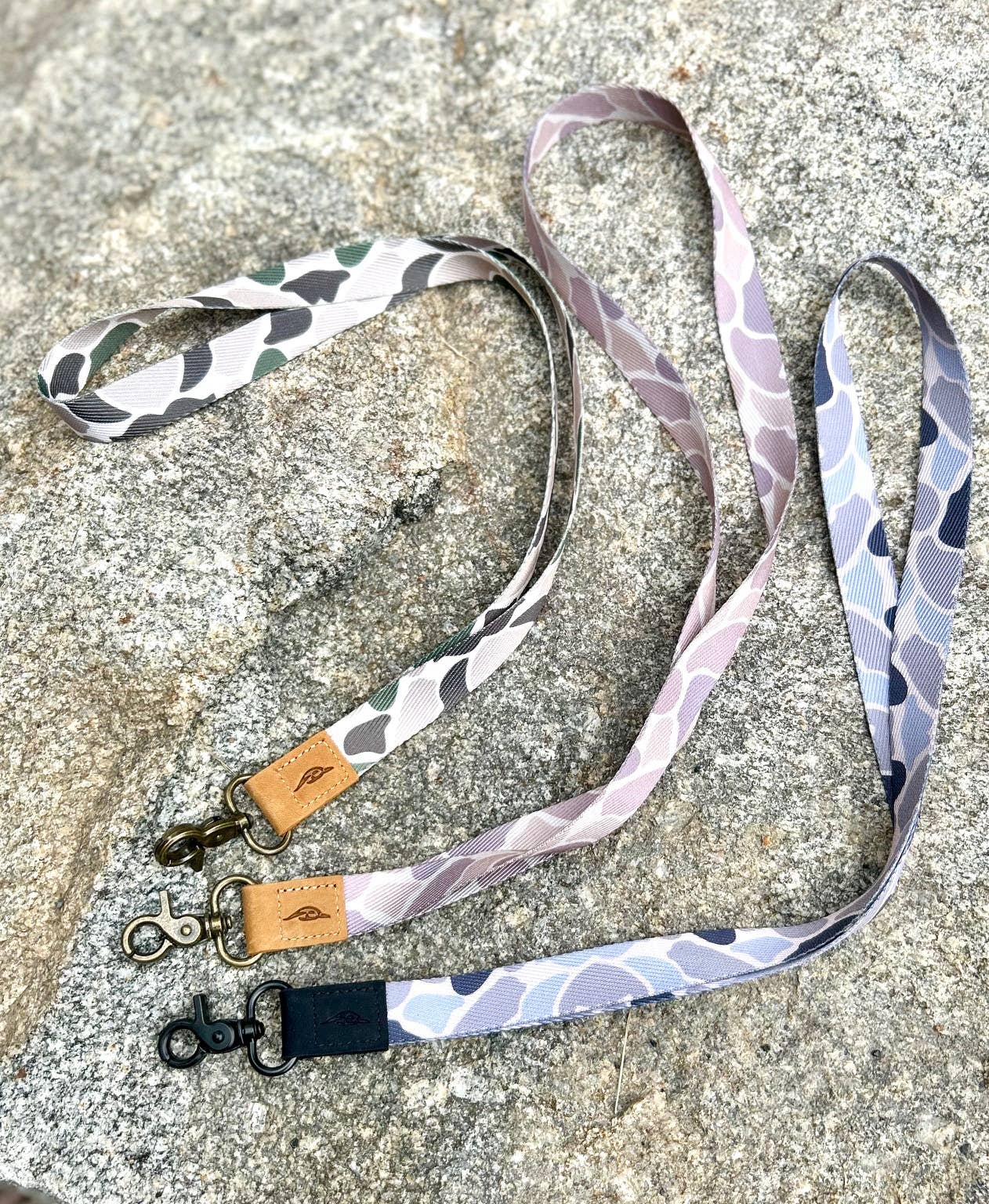A lanyard featuring our Brown Ranch Camo. Features include a metal clasp, leather logo at the bottom, and an Embry Outdoors tag in the middle!