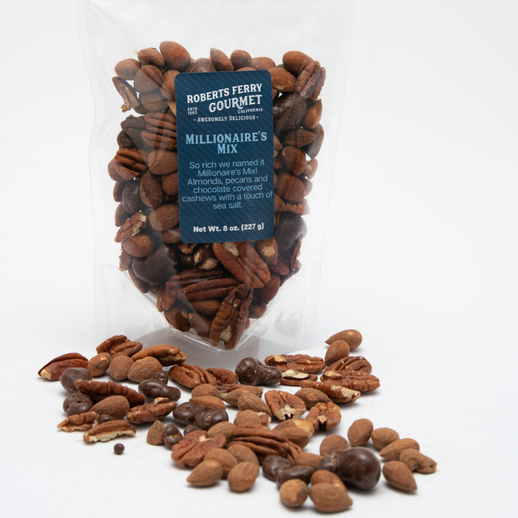 Made in United States Shelf life: 6–12 months Storage: Shelf-stable Ingredients: Cinnamon Glazed Nuts Almonds, Cashews, Pecans, Sugar, cocoa, butter, dry whole milk chocolate, liqueur, lecithin as an emulsifier, spice, salt, natural & artificial flavors