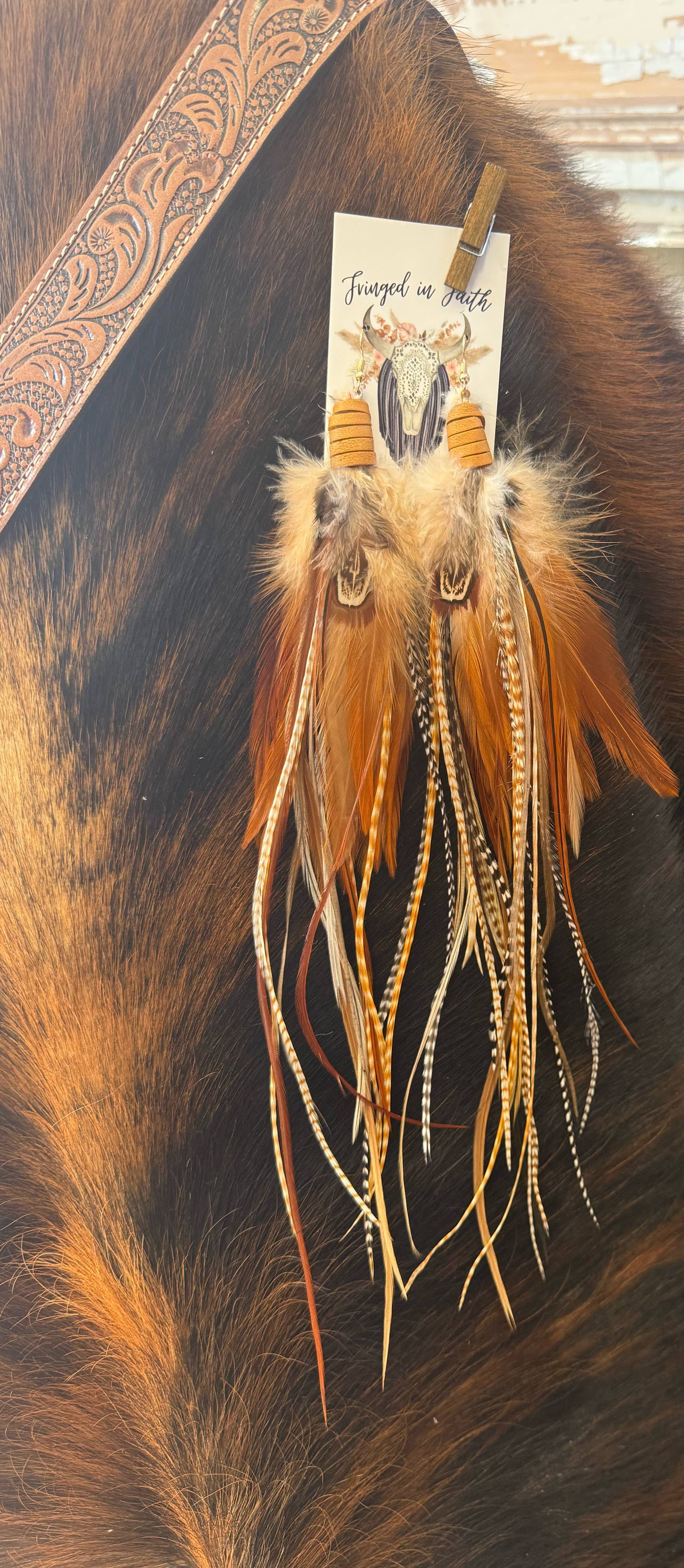 Beautiful feather bundle with brown, black, camel, tan and white feathers wrapped in brown leather. This statement earring looks stunning and is sure to grab the attention of others! Materials: feathers, genuine leather and nickel free hooks Size: 12" L