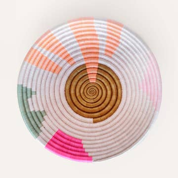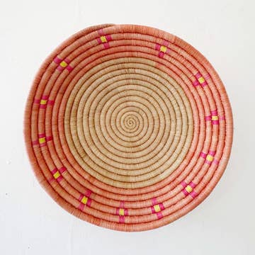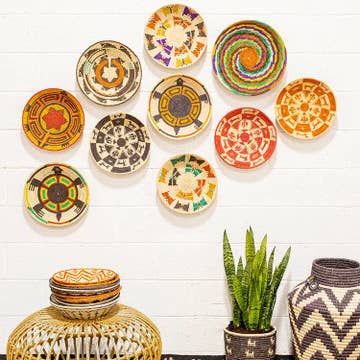 These Bariku bowls feature the medium "Rainbow" bowl and small bowls with single coordinating colours to match. A fresh and summery set! One Full Set Remaining until restock - or buy separately - small 7" x 2" - single colour bowls - medium 12" x 3" - rainbow bowl only - cheery symmetrical diamond pattern - diamonds on tea colour background - functional and decorative - loop on back for hanging - great for basket walls or dry serving set Celebrate your love for people, resilience and beauty with our artisan-made home décor and gifts. Azizi Life is committed to loving, fair trade, ethical relationships. A portion of proceeds supports community impact programs. Bring ethical, fair trade beauty into your home décor. Each bowl has a loop on the back for hanging.