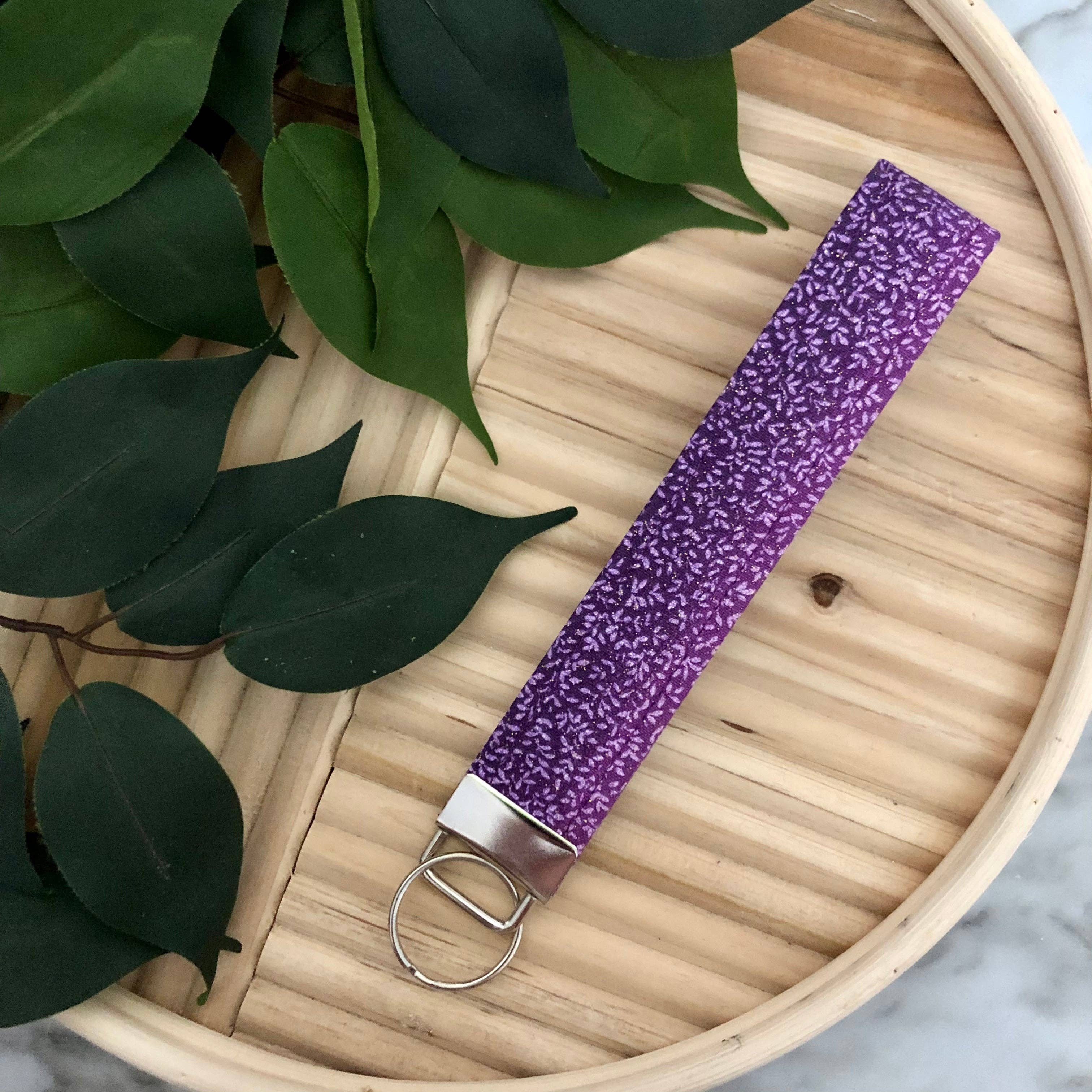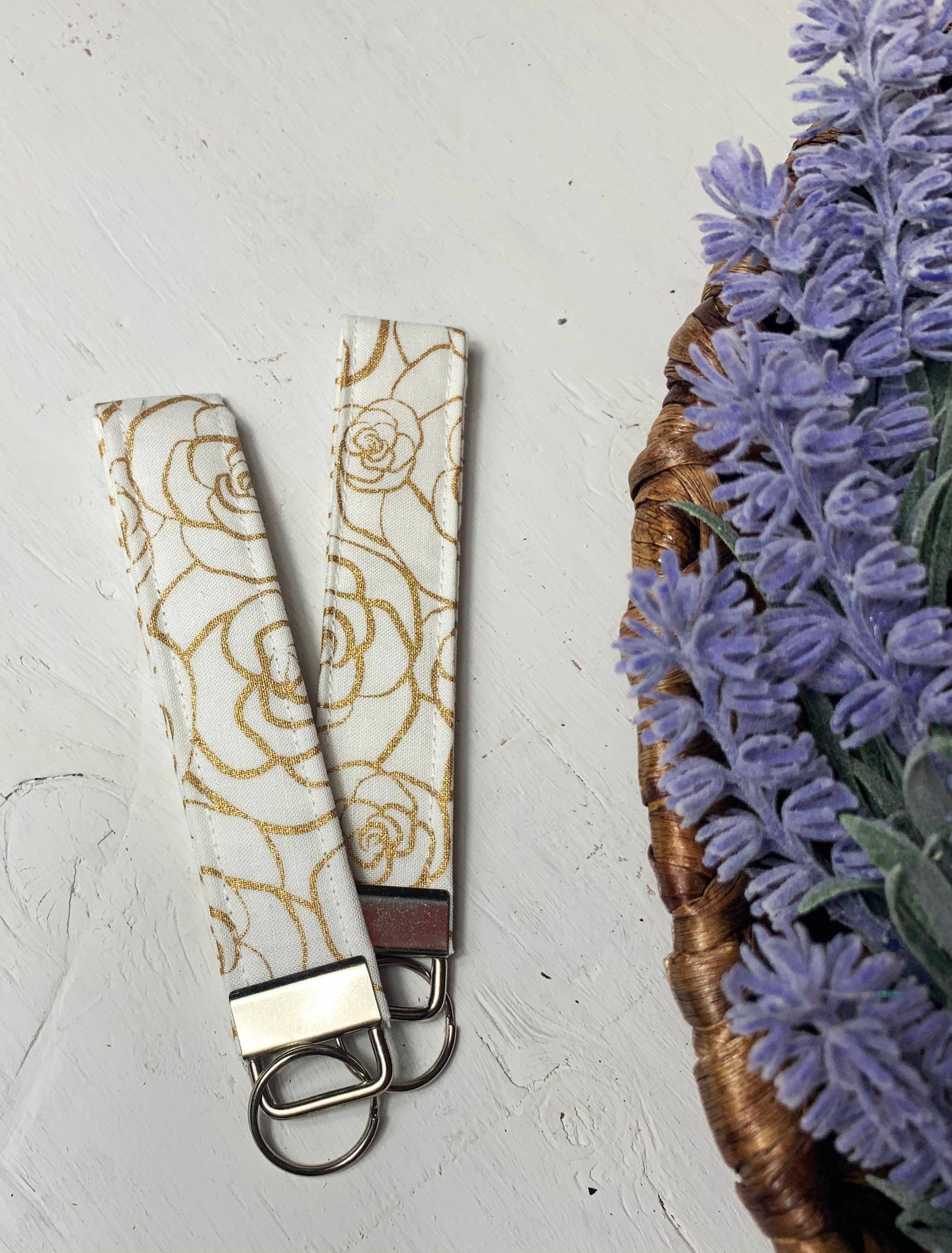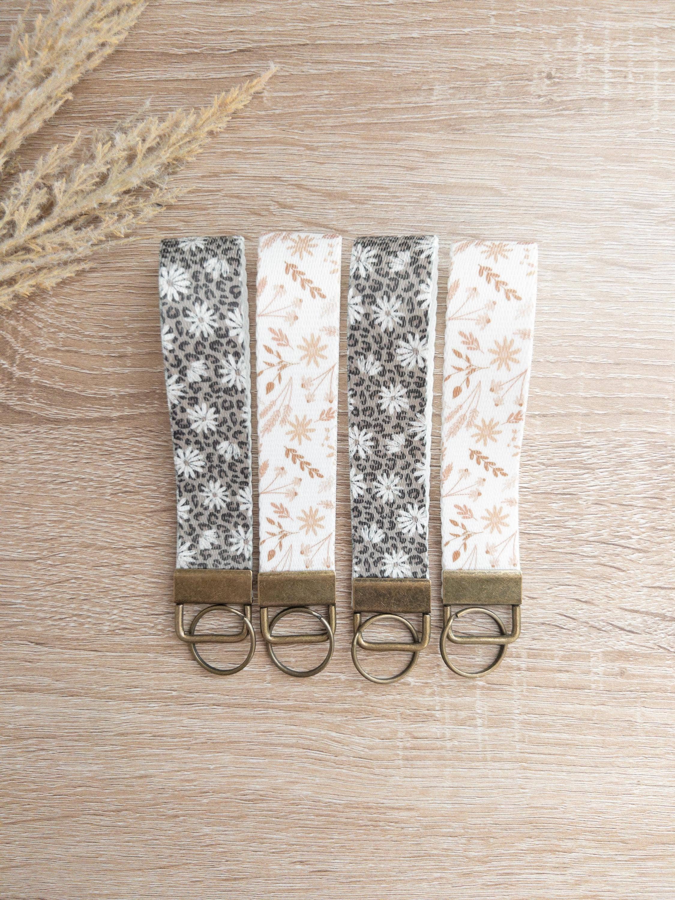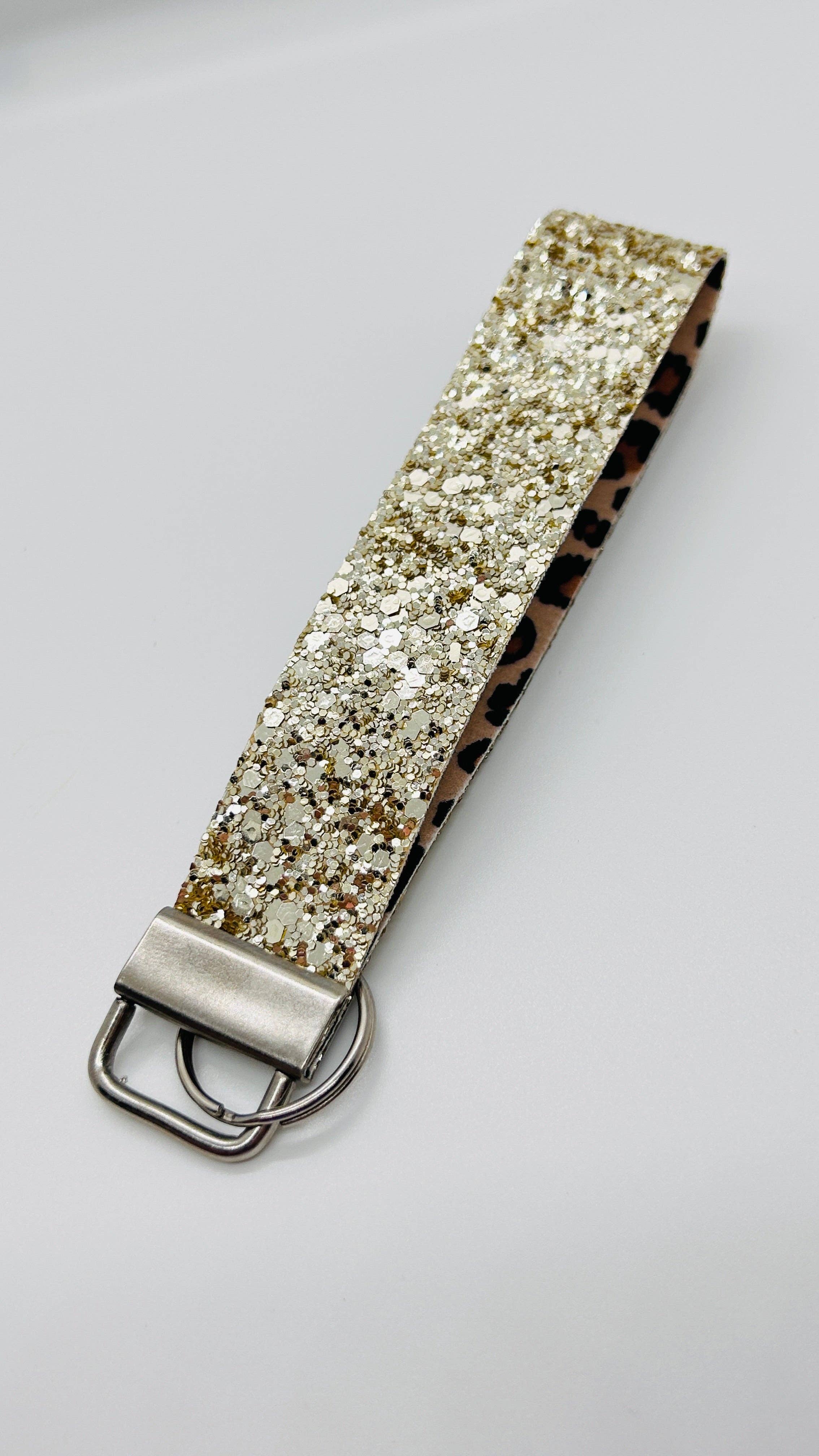 Bumble bees and glitter make for the cutest wristlet keychain! Perfect to slip onto your wrist and go run errands! Made from faux leather so you don't have to worry about any fabric getting dirty. Each keychain is double backed with faux leather, hot glued in between and then sewn to give a clean and finished look. Each wristlet is 1 inch wide and 6-7 inches long depending on the design. Since each design is cut from a different sheet of leather the length varies. This keychain is made from a gold multi-colored glitter with bees on it, while the inner layer is a floral bee print. Slight variations may occur since each product is handmade.