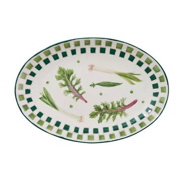 Generously sized platter with a dramatic beaded edge. Per uzshe, each one is handmade so there are variations in sizing of bobbles and glazing is perfectly imperfect. * glazed stoneware * one-of-a-kind * microwave & dishwasher safe * NOT oven safe * 15" x 10.5" x 1"