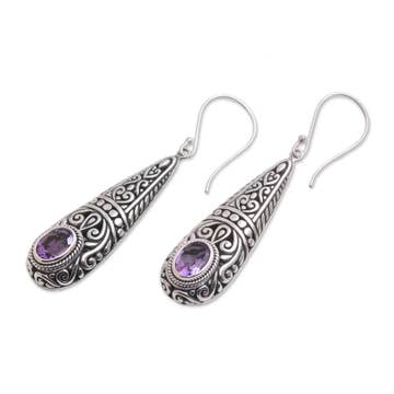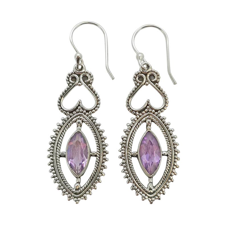 Beautifully decorated sterling silver earrings featuring faceted Amethyst stones. 1.5" long by .5" wide. Handmade jewelry, jewelry, brass jewelry, silver jewelry, sterling silver, gold plated, handmade, handmade gifts, fair trade, bohemian, boho, fashion jewelry, fashion, slow fashion, ethical, India, Thailand, artisan, artisan made, necklace, bracelet, ring, earring, anklet, ear cuff, ear climber, ear jacket, spinning ring, spinner ring, stacking ring, stacker ring, holiday gift, Christmas gift, gift, unique jewelry, boho jewelry, trendy jewelry