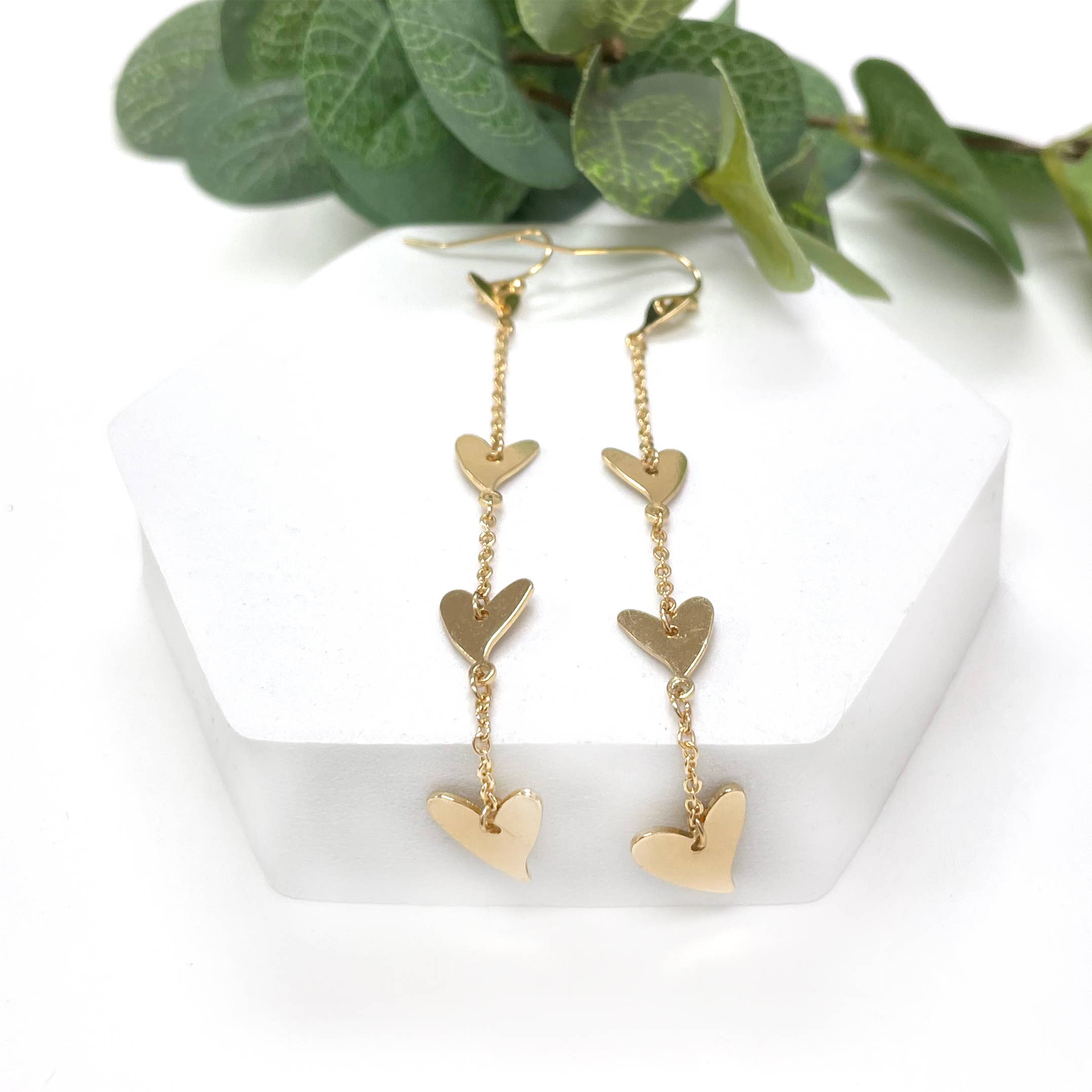 Heart charm earrings with a faceted stone connecting it to the chain. An elegant, subtle, lightweight, and fun dangly earring. Can't decide on stones? Opt for our Heart Earring Pack to get an assortment of all stones + a free display. Materials: - matte gold chain - lead and nickel free ear wires - 1" chain + heart charm - 1/2" brass heart - 4 mm semi-precious stones Stones: - Moonstone (white)--healing + calming - Garnet (red)--energizing + regenerative - Rhodochrosite (pink)--compassion + openness - Labradorite (grey)--strength + calm - Pyrite (silver)--protection + focus - Amethyst (purple)--relief + balance