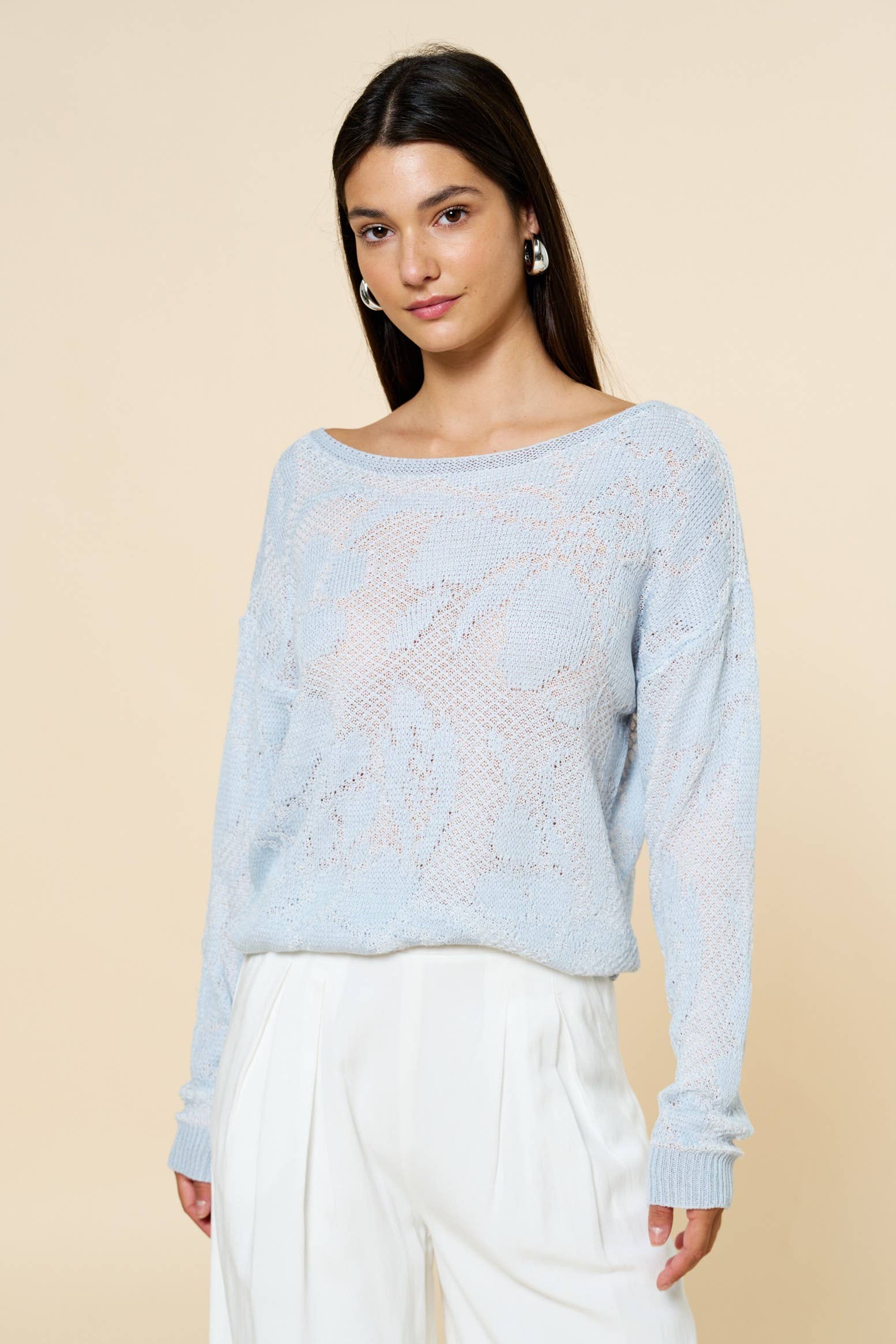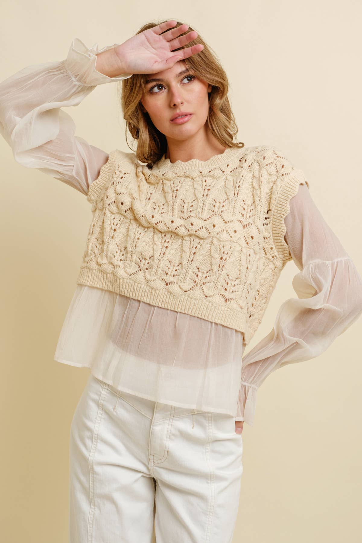 Introducing Cloud Ten's CSW11746A - Crochet Layered Top, a preppy piece for the modern contemporary woman. This cable knit top with a crew neck and long sleeves is perfect for the pre-fall season and holiday occasions. Machine washable for easy care. Designed and produced with the utmost care in Los Angeles, this top represents a perfect blend of trendy, chic, and edgy. Whether you're following the trends or setting them, this top is an ideal choice. Join the Cloud Ten family, where we always prioritize style and quality.