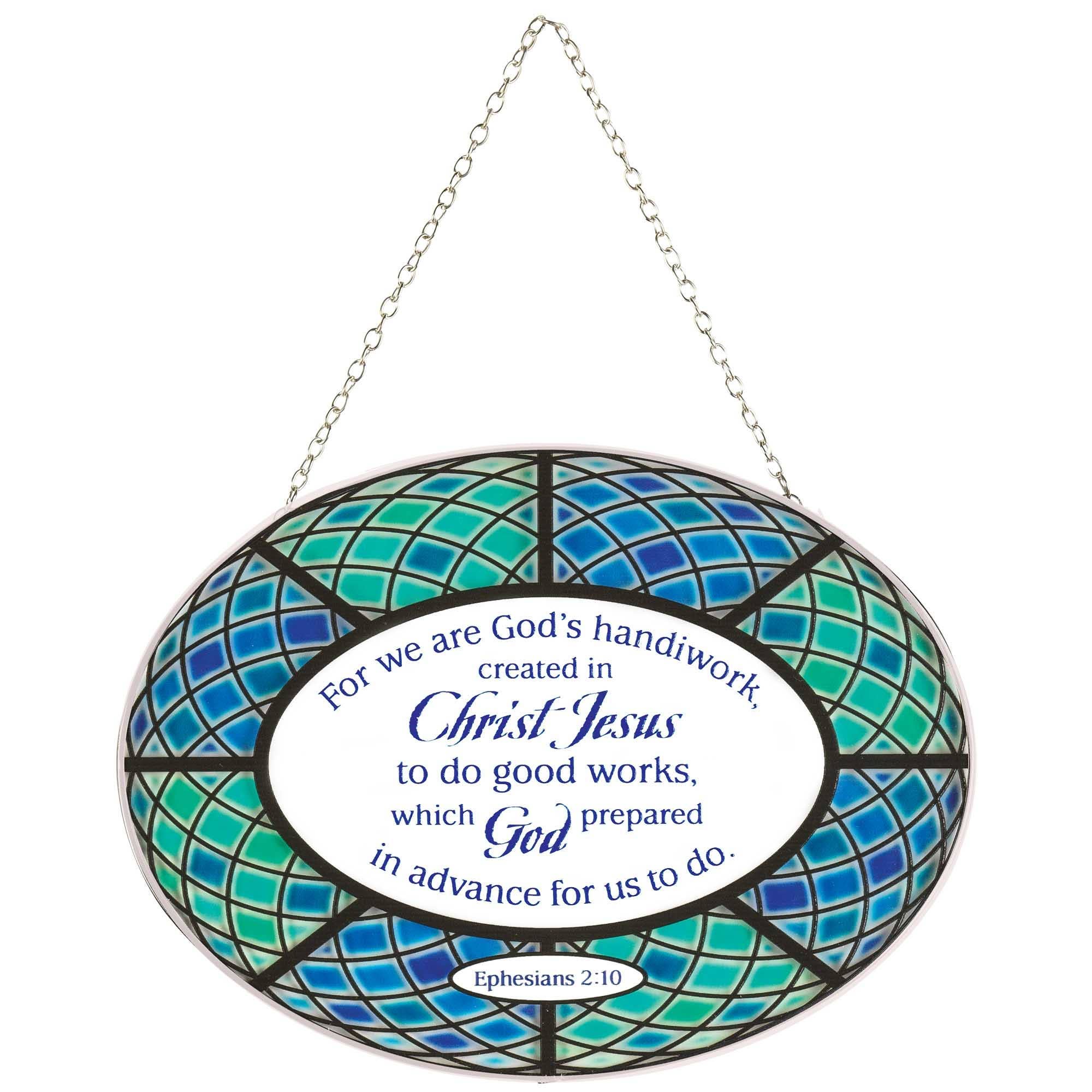 Welcome springtime with this oval shape suncatcher that shines with a colorful outline and Ephesians 2:10: For we are God's handiwork, created in Christ Jesus to do good works, which God prepared in advance for us to do. Size is 9 wide x 6 high. Finished with silver tone metal frame and hanging chain; clear suction cup included. Comes in a window box, all ready for gift giving.