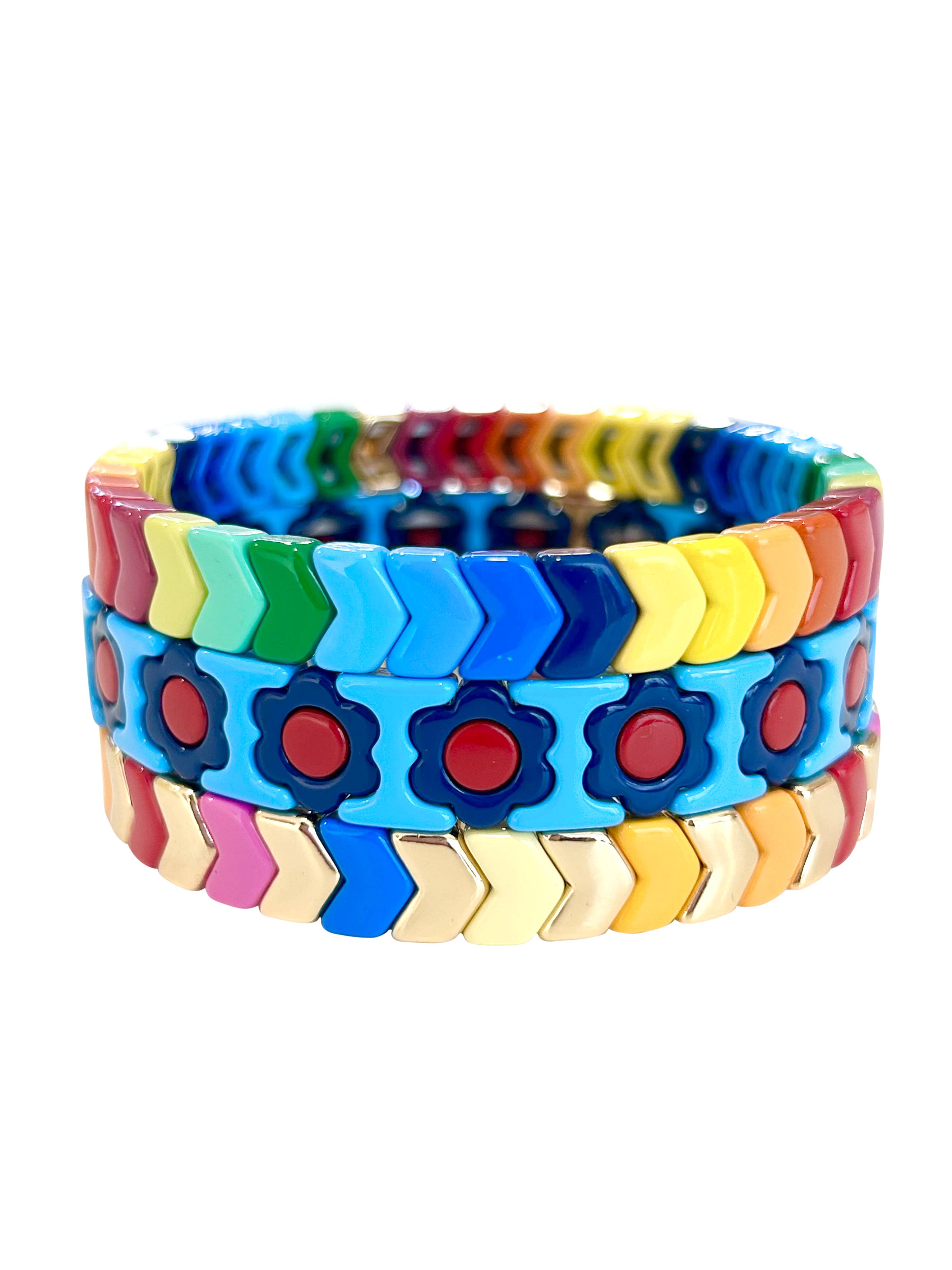 A fun and bright stack of five beaded bracelets! Assorted beads are strung on thick elastic.