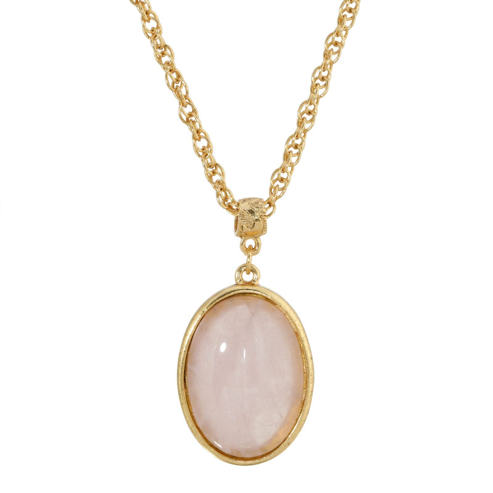 Rose quartz symbolizes universal love and harmony. This necklace adds a symbolic touch to the wearer. Product Details: Gold tone necklace with rose quartz pendant Fill with your favorite essential oils Necklace: approx 16" length with 3" extension Pendant: approx. 1" in diameter; sizes may vary due to use of natural stone Clasp: lobster