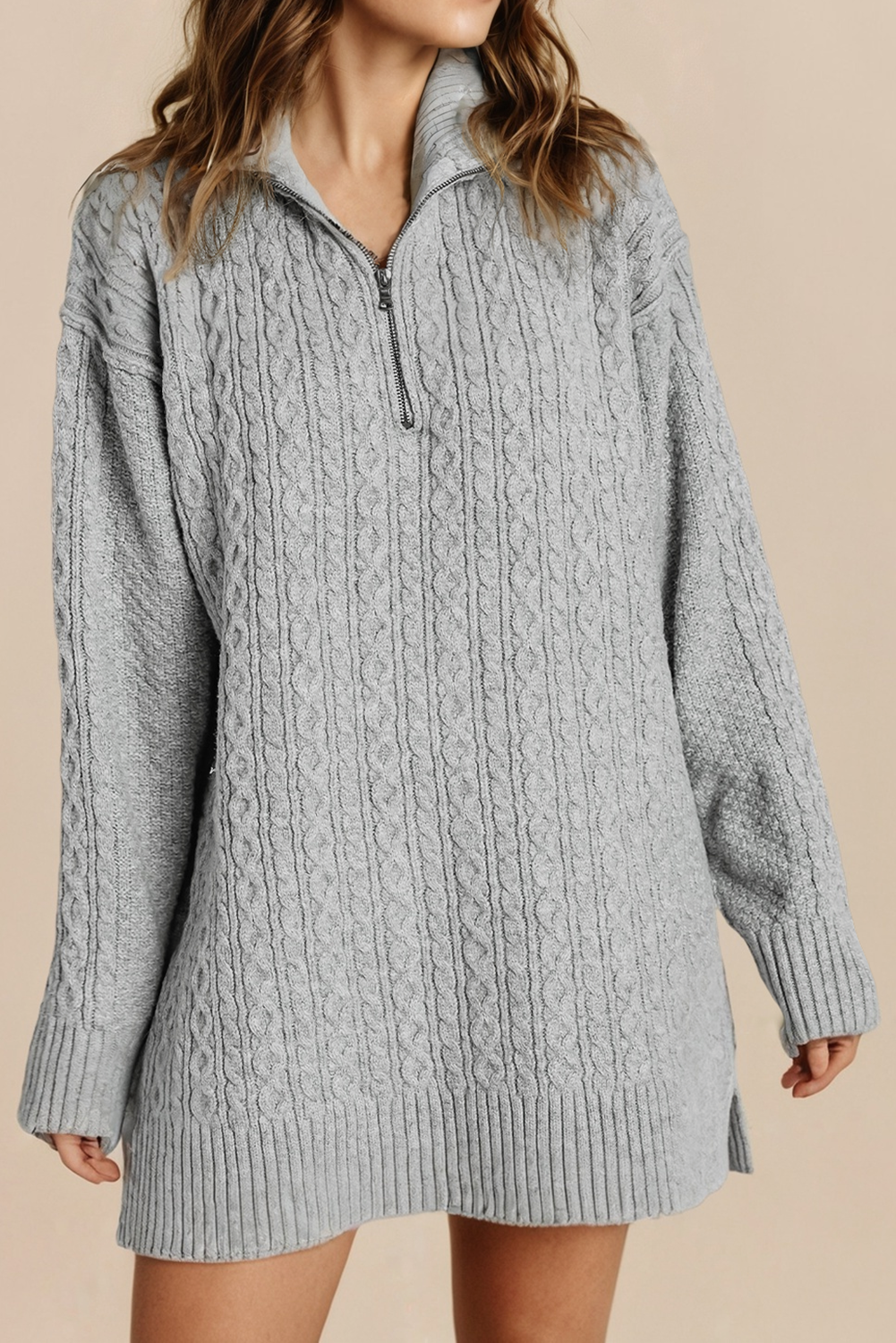 This cozy mock neck sweater dress features a clean silhouette with a relaxed, oversized fit and soft knit texture. Designed with ribbed detailing at the neck, cuffs, and hem, it offers both structure and comfort. Easy to style with tall boots or layered under coats - a timeless cold-weather staple your customers will love. Model is 5'10" and wearing a size Small. Measurements: Bust 34B / Waist 24.5" / Hips 36"
