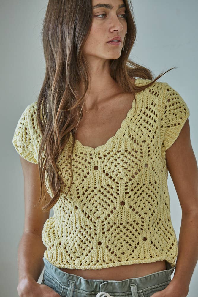 Immerse yourself in the ultimate luxury of ready-to-wear fashion with By Together's CALI CROCHET TOP. This trendy Boho Chic knit sweater features a round neck and short sleeves, making it perfect for everyday wear. Crafted with 96% cotton and 4% nylon, it offers a comfortable contemporary fit. Suitable for the fall/winter season, this preppy top requires hand washing. With By Together, you are investing in timeless fashion tailored for the everyday woman.