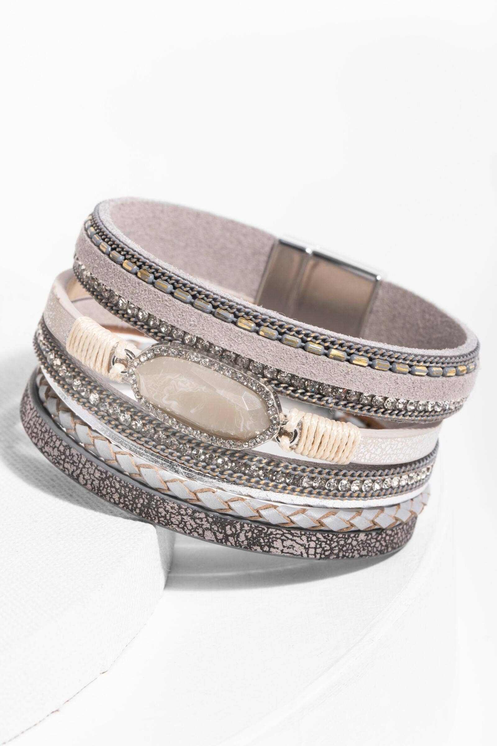 SILVER LEATHER WRAP BRACELET MULTI STRAND MAGNETIC CLASP