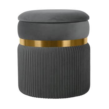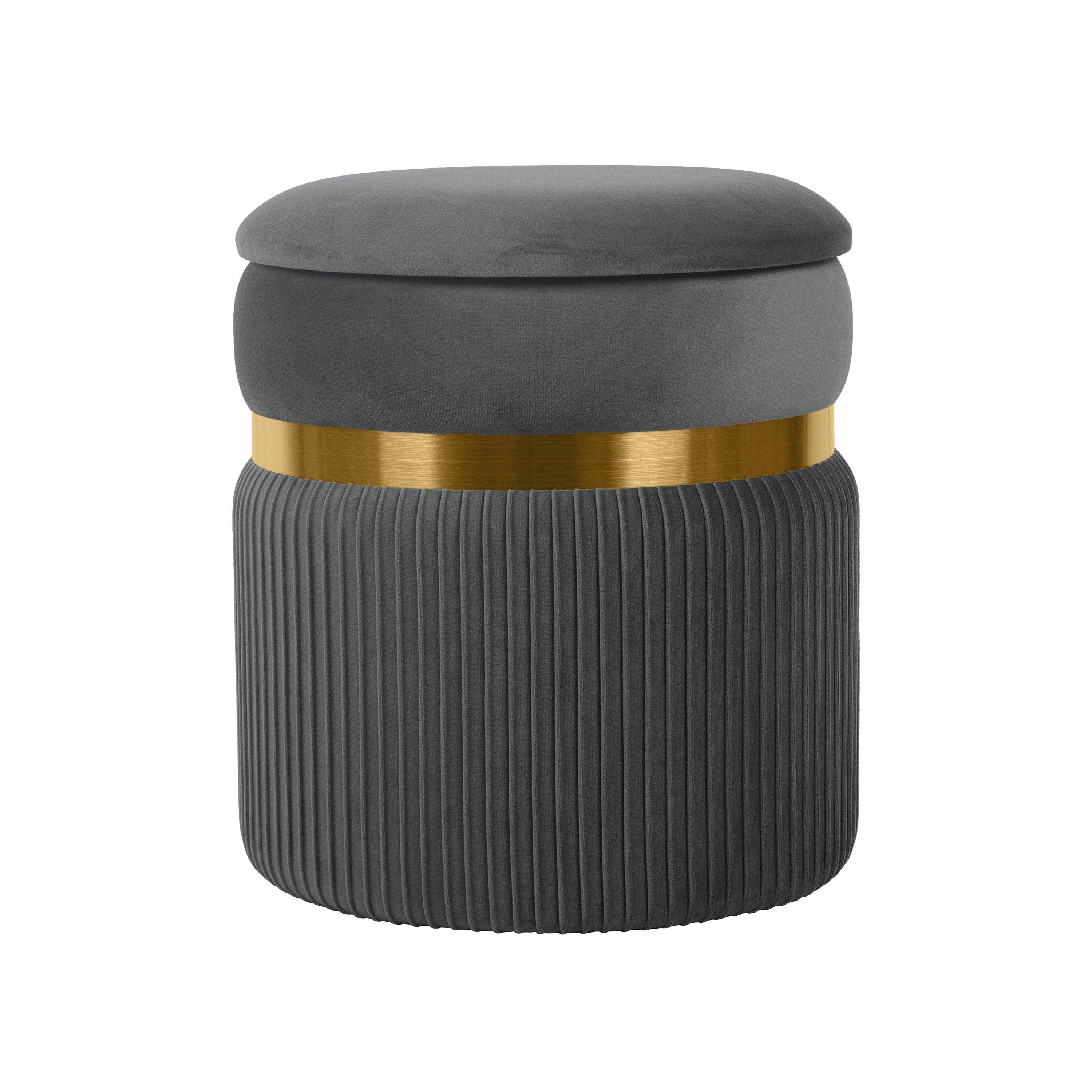 Accent your living room with this Charlotte round-shaped black ottoman with a gold base. This contemporary ottoman comes fully upholstered in velvet fabric for a soft and plush feel. It has a removable top lid that offers storage space to accommodate small items of everyday use. All the materials used in the construction are sturdy and durable. The gold-colored base puts up a striking contrast to the black upholstery for added appeal. Design: Black-colored round ottoman with a removable top and gold base Colour:Black Material:Velvet Dimension:17.75 DIA X 17.75 H