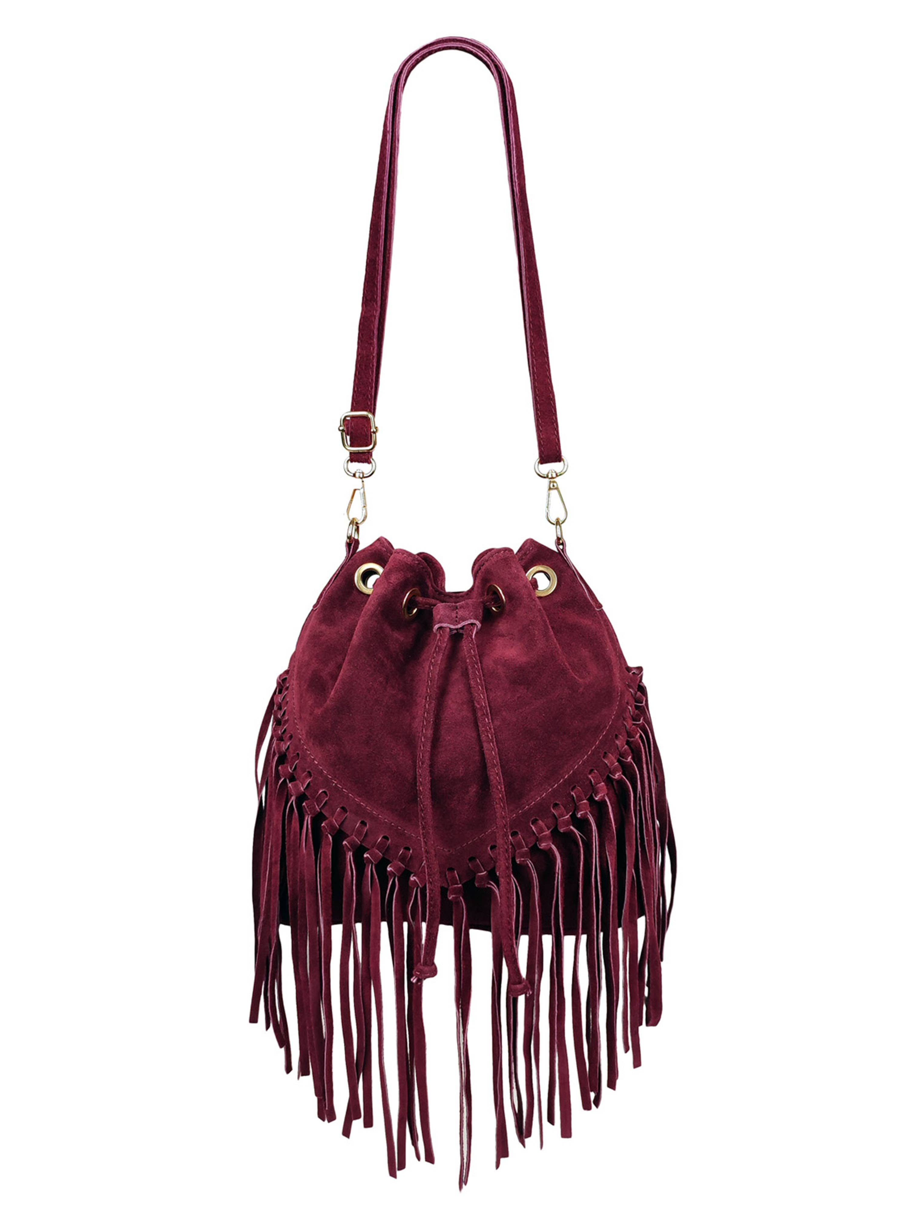 Suede leather Drawstring closure Frange Removable and adjustable shoulder strap Internal zip pocket Fabric lining Gold hardware