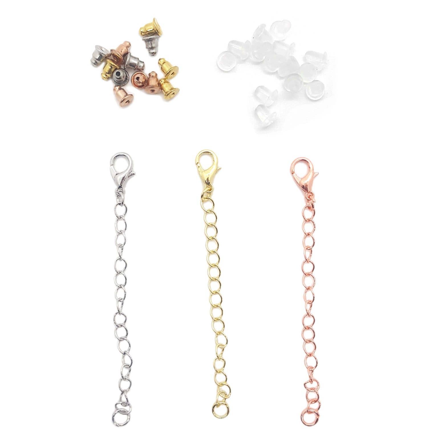 Chain extenders in gold and silver in each of the following sizes. 4 pieces per package. 3 inches 6 inches Lobster Clasp for easy attachment Finish: Gold and Silver Tone Content: Zinc, Alloy, Iron