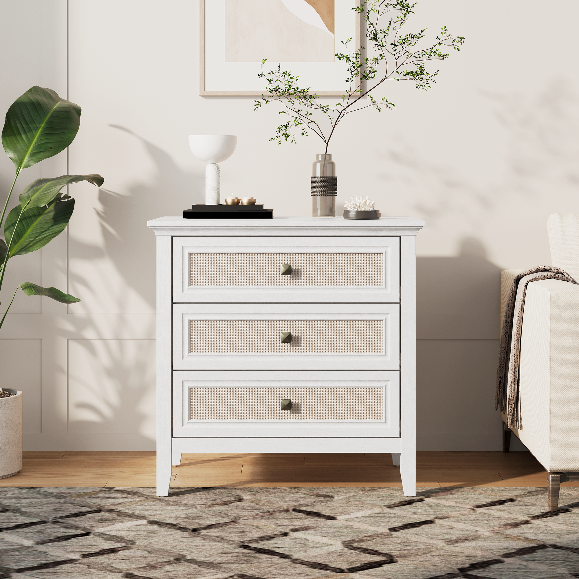This gray 3-drawer cabinet blends classic American furniture design with natural textures. Made from durable MDF with a woodgrain finish, it features drawer fronts crafted from natural rattan for breathability, insect resistance, and a light, airy look. The curved metal handles offer easy, comfortable access, while the sturdy structure supports up to 100 lbs. Ideal for bedrooms, living rooms, or study areas, this cabinet provides stylish and functional storage for any modern interior. Key Features: ✔️ Three spacious drawers with natural rattan panels ✔️ Breathable, moth-resistant rattan front design ✔️ MDF body with woodgrain look in modern gray finish ✔️ Soft-touch curved metal handles for easy access ✔️ Estimated load capacity: 100 lbs ✔️ Compact yet functional size for small spaces ✔️ Dimensions: 31.5in L x 14.96in W x 30.51in H Perfect for: • Bedroom clothing or accessory storage • Living room side cabinet or display piece • Study room organizer or home office solution